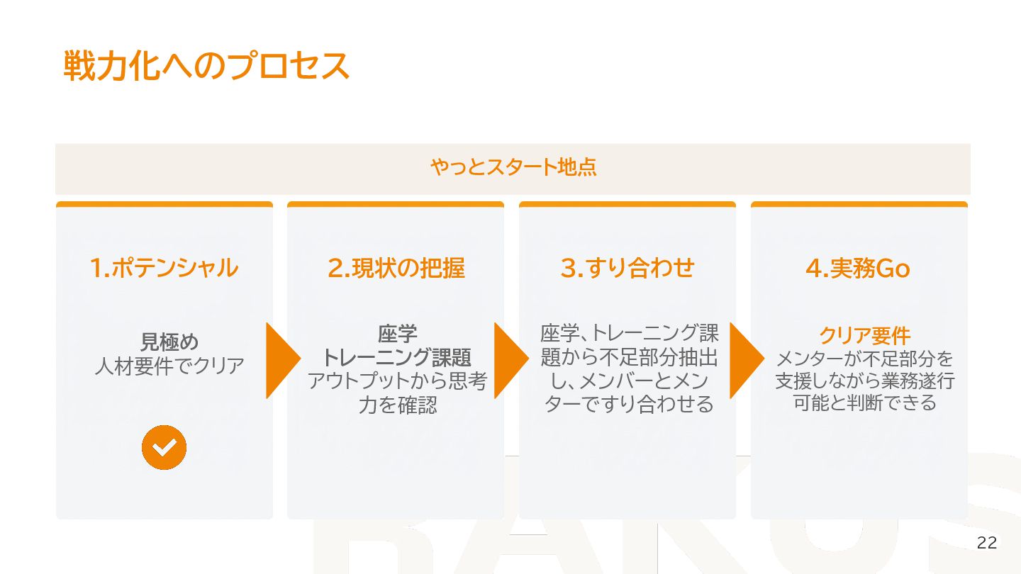 戦力化へのプロセス 22 1.ポテンシャル 2.現状の把握 3.すり合わせ 4.実務Go 見極め 人材要件でクリア 座学 トレーニング課題