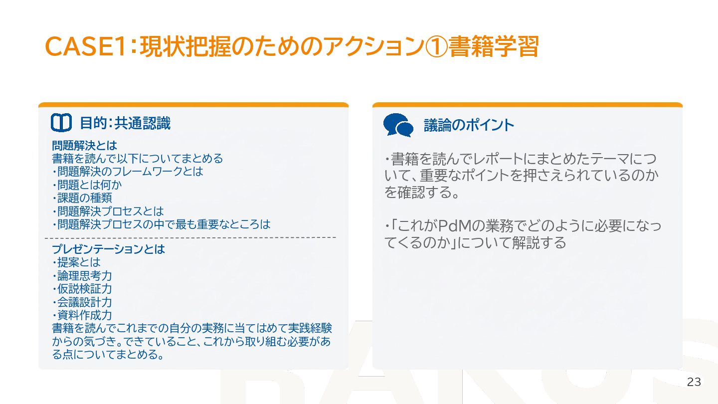 CASE1:現状把握のためのアクション①書籍学習 23 目的:共通認識 議論のポイント ・書籍を読んでレポートにまとめたテーマにつ いて、重要なポイントを押さえられているのか を確認する。 ・「これがPdMの業務でどのように必要になっ てくるのか」について解説する 問題解決とは