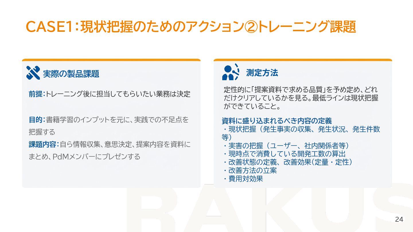 CASE1:現状把握のためのアクション②トレーニング課題 実際の製品課題 前提:トレーニング後に担当してもらいたい業務は決定 目的:書籍学習のインプットを元に、実践での不足点を 把握する 課題内容:自ら情報収集、意思決定、提案内容を資料に まとめ、PdMメンバーにプレゼンする 測定⽅法 資料に盛り込まれるべき内容の定義 ・現状把握(発生事実の収集、発生状況、発生件数