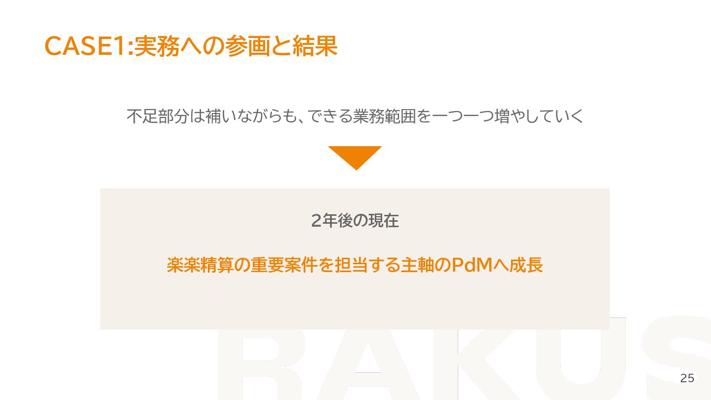 CASE1:実務への参画と結果 25 不足部分は補いながらも、できる業務範囲を一つ一つ増やしていく 2年後の現在 楽楽精算の重要案件を担当する主軸のPdMへ成長