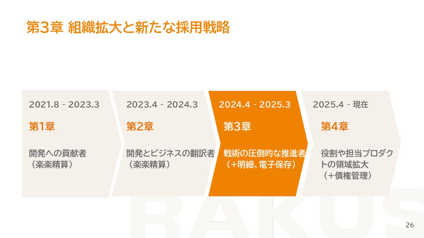 第3章 組織拡大と新たな採用戦略 26 2021.8 - 2023.3 第1章 開発への貢献者 (楽楽精算) 2023.4