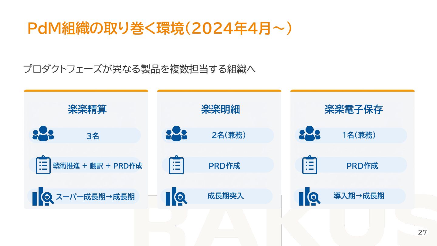 3名 楽楽明細 成長期突入 PRD作成 2名(兼務) 楽楽電子保存 導入期→成長期 PRD作成 1名(兼務)