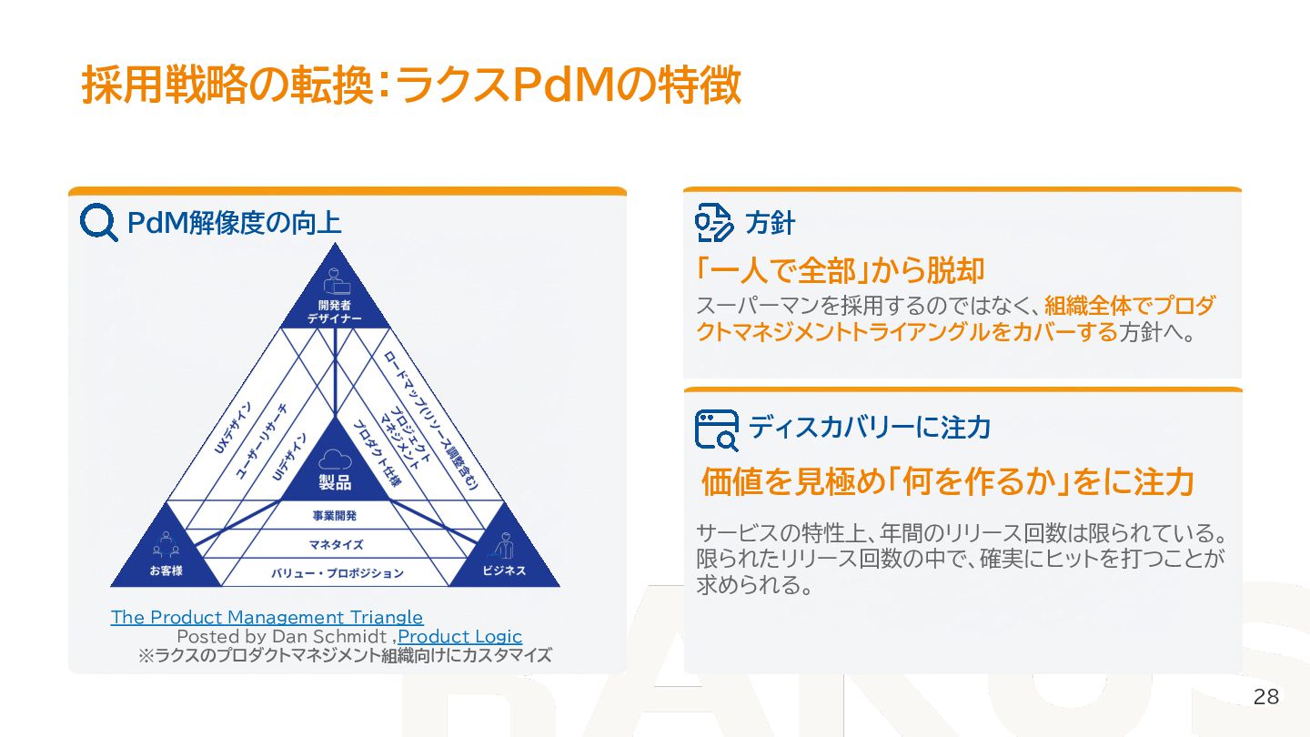 採用戦略の転換:ラクスPdMの特徴 28 PdM解像度の向上 方針 The Product Management Triangle Posted by