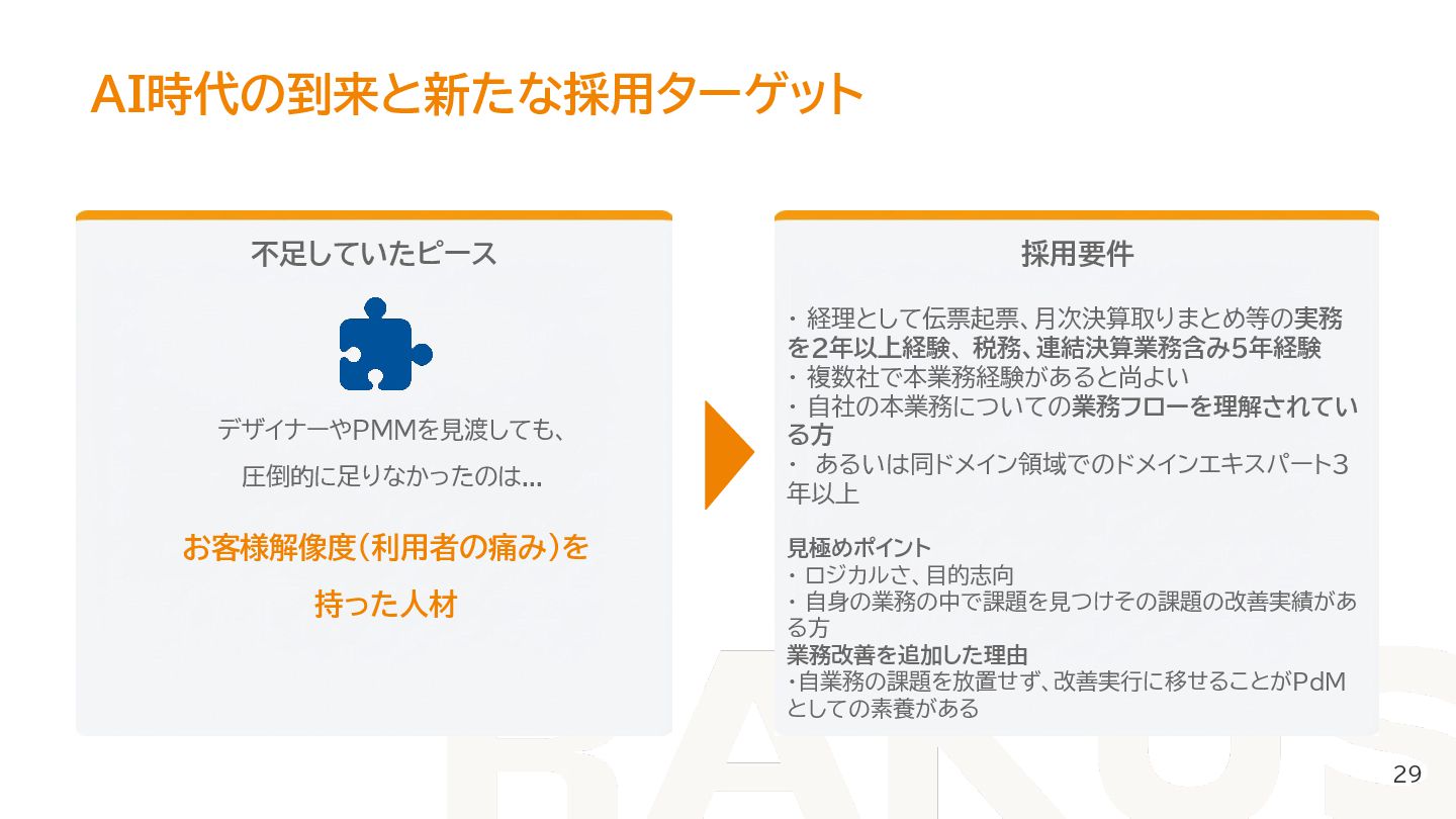 AI時代の到来と新たな採用ターゲット 29 不足していたピース デザイナーやPMMを見渡しても、 圧倒的に足りなかったのは... お客様解像度(利用者の痛み)を 持った人材 採用要件 ・ 経理として伝票起票、月次決算取りまとめ等の実務