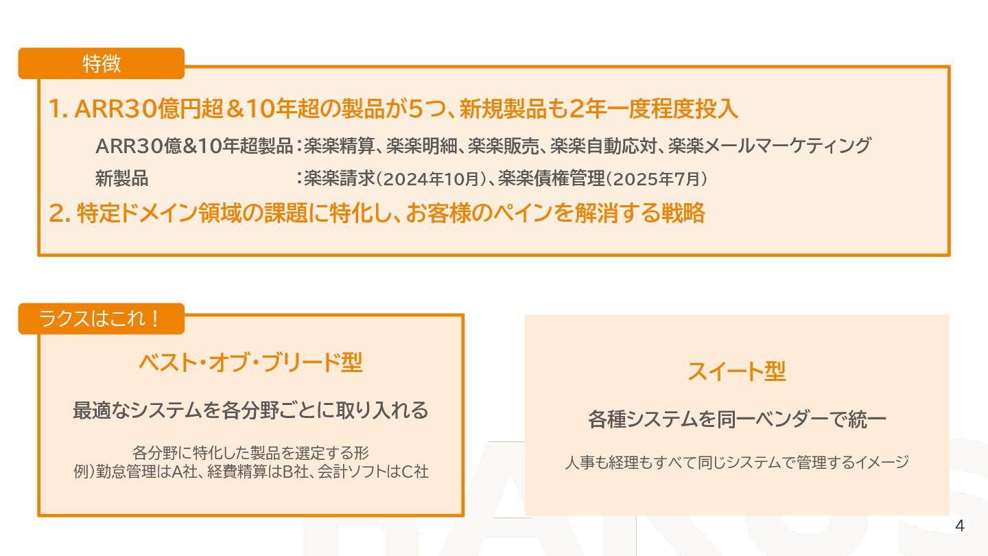 ARR30億&10年超製品:楽楽精算、楽楽明細、楽楽販売、楽楽自動応対、楽楽メールマーケティング 新製品 :楽楽請求(2024年10月)、楽楽債権管理(2025年7月) 2.特定ドメイン領域の課題に特化し、お客様のペインを解消する戦略 特徴