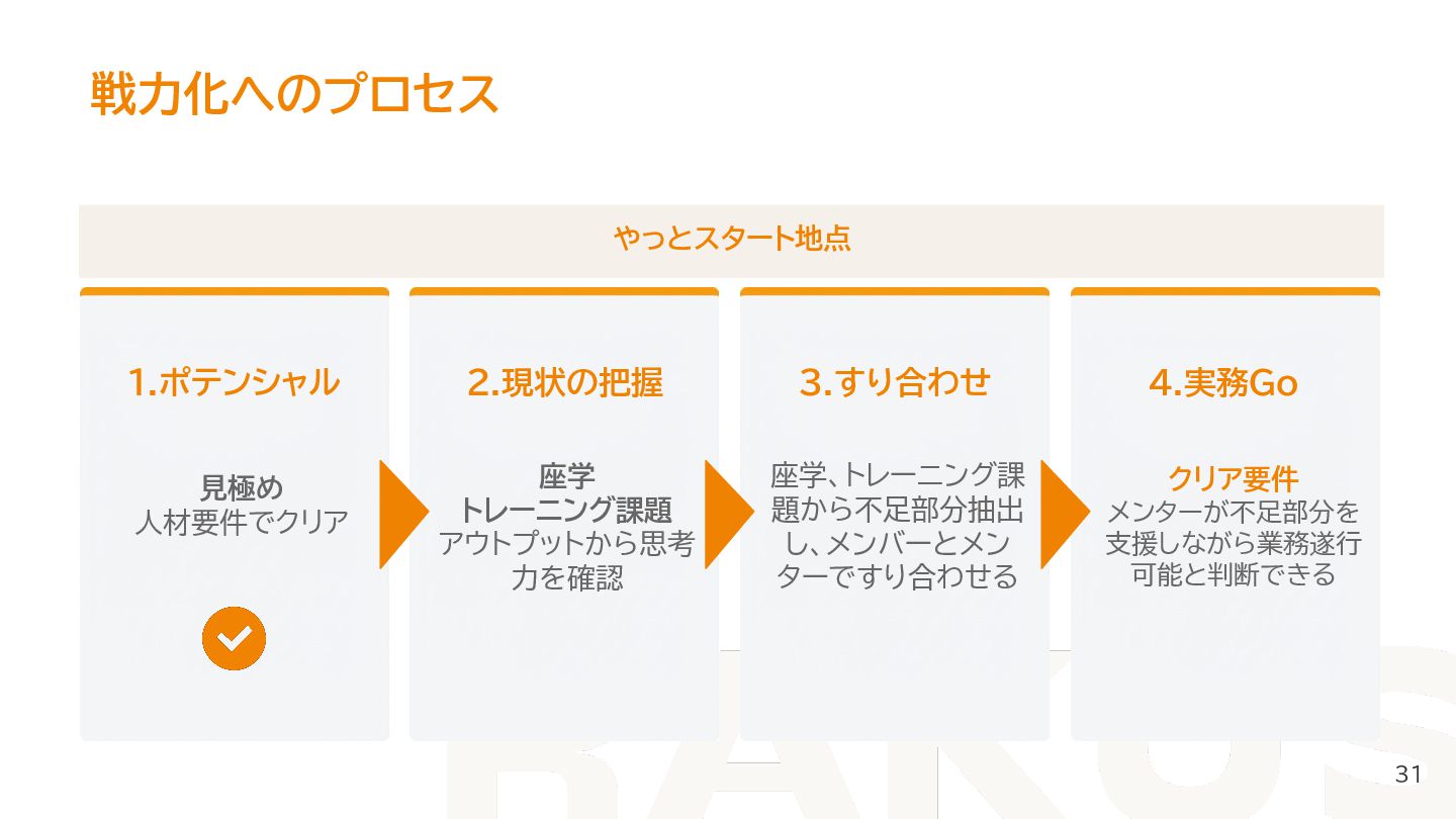 戦力化へのプロセス 31 1.ポテンシャル 2.現状の把握 3.すり合わせ 4.実務Go 見極め 人材要件でクリア 座学 トレーニング課題
