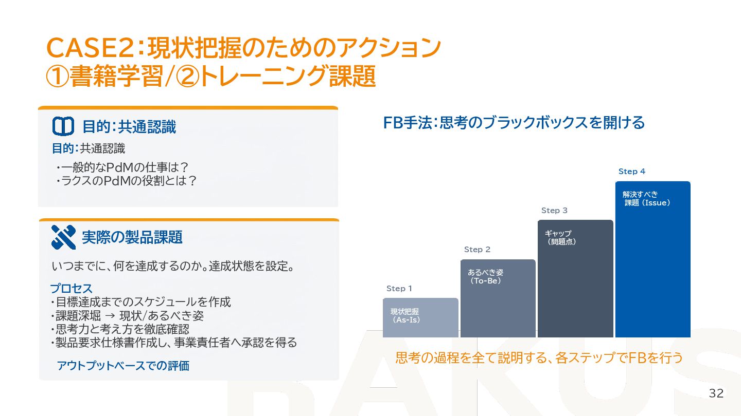 現状/あるべき姿 ・思考力と考え方を徹底確認 ・製品要求仕様書作成し、事業責任者へ承認を得る ・一般的なPdMの仕事は? ・ラクスのPdMの役割とは? 思考の過程を全て説明する、各ステップでFBを行う Step 1 現状把握 (As-Is) Step 2 あるべき姿 (To-Be) Step 3 ギャップ (問題点) Step 4 解決すべき 課題 (Issue) FB手法:思考のブラックボックスを開ける アウトプットベースでの評価 目的:共通認識