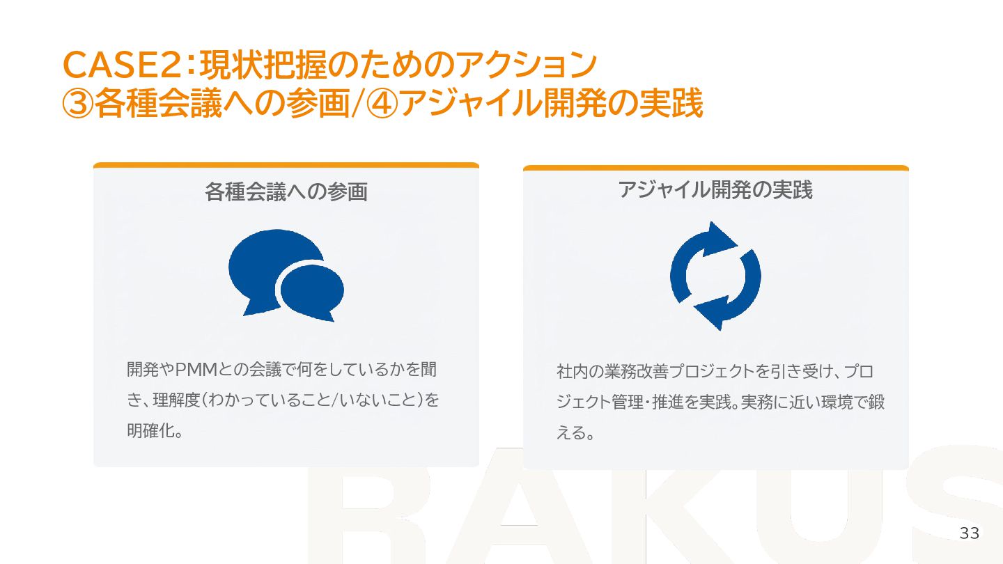 CASE2:現状把握のためのアクション ③各種会議への参画/④アジャイル開発の実践 33 各種会議への参画 アジャイル開発の実践 開発やPMMとの会議で何をしているかを聞 き、理解度(わかっていること/いないこと)を 明確化。 社内の業務改善プロジェクトを引き受け、プロ ジェクト管理・推進を実践。実務に近い環境で鍛