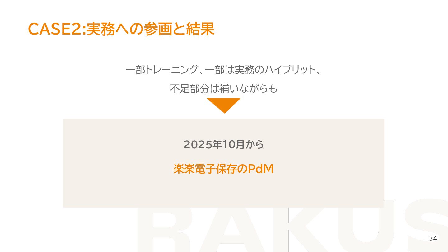 CASE2:実務への参画と結果 34 一部トレーニング、一部は実務のハイブリット、 不足部分は補いながらも 2025年10月から 楽楽電子保存のPdM