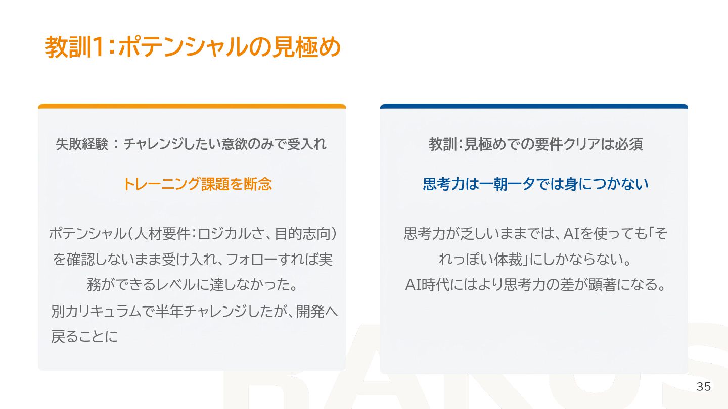 思考力が乏しいままでは、AIを使っても「そ れっぽい体裁」にしかならない。 AI時代にはより思考力の差が顕著になる。 ポテンシャル(人材要件:ロジカルさ、目的志向) を確認しないまま受け入れ、フォローすれば実 務ができるレベルに達しなかった。