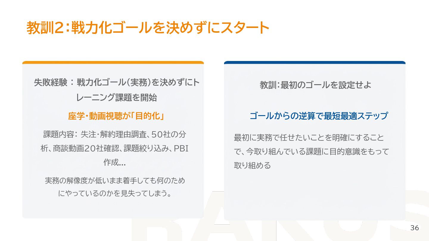 ゴールからの逆算で最短最適ステップ 最初に実務で任せたいことを明確にすること で、今取り組んでいる課題に目的意識をもって 取り組める 課題内容: 失注・解約理由調査、50社の分 析、商談動画20社確認、課題絞り込み、PBI 作成...