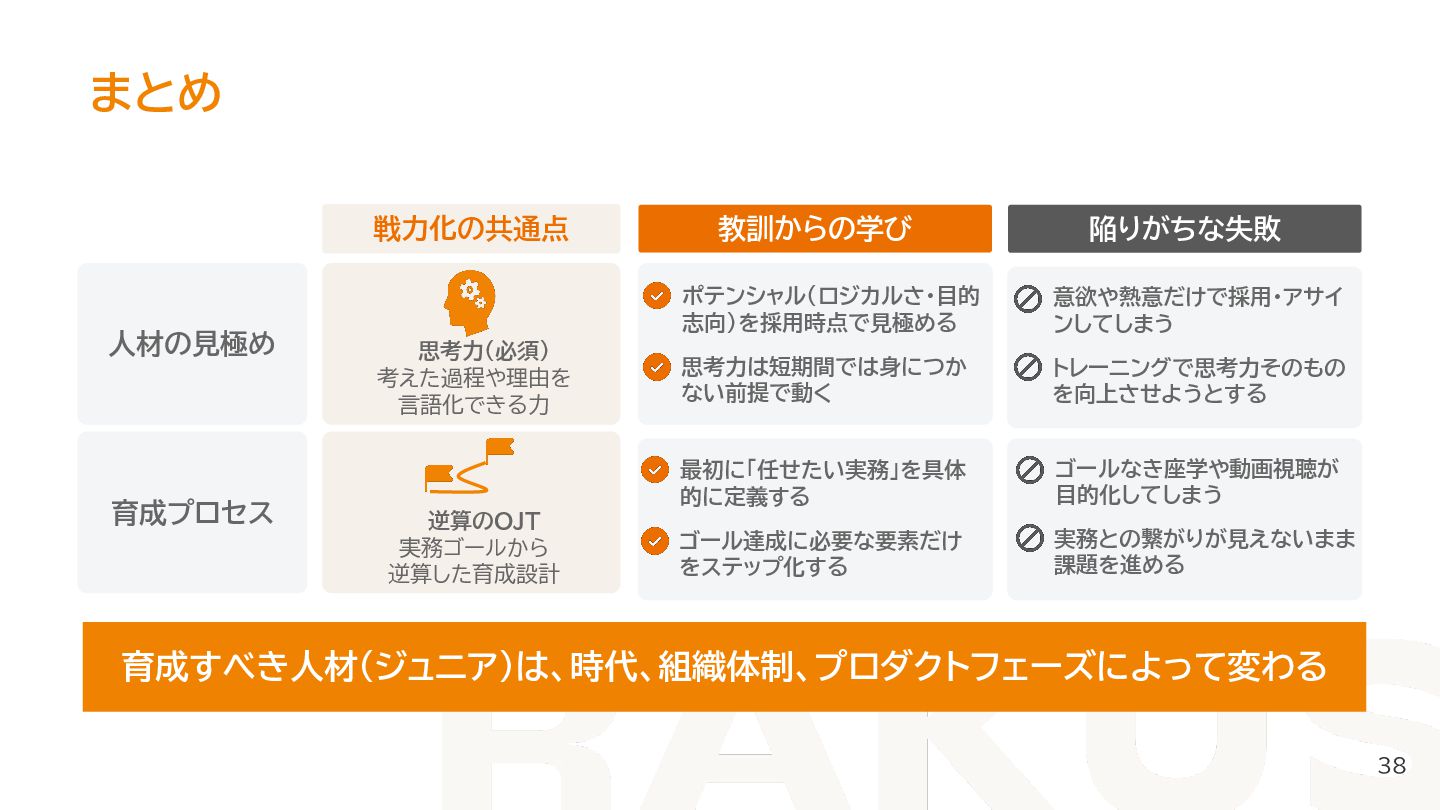 まとめ 38 育成すべき人材(ジュニア)は、時代、組織体制、プロダクトフェーズによって変わる 人材の見極め 育成プロセス 戦力化の共通点 教訓からの学び 陥りがちな失敗 思考力(必須) 考えた過程や理由を