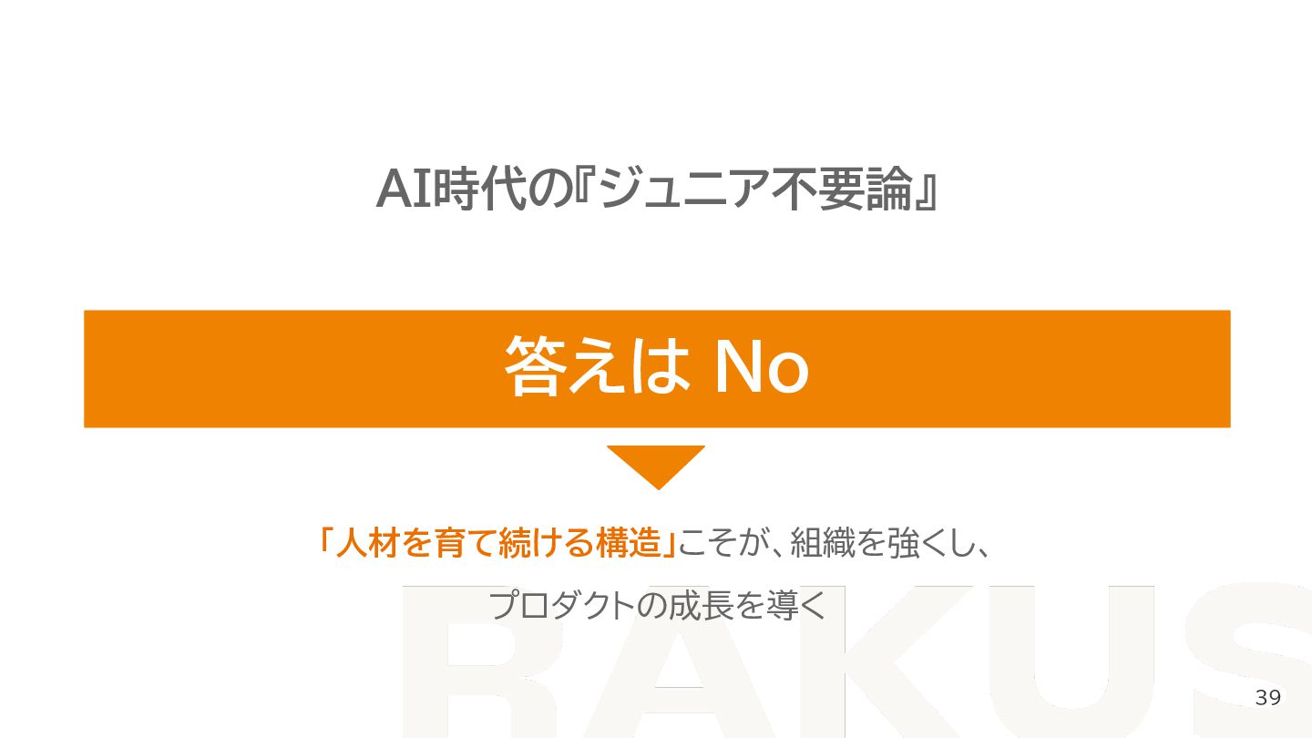 39 AI時代の『ジュニア不要論』 「人材を育て続ける構造」こそが、組織を強くし、 プロダクトの成長を導く 答えは No