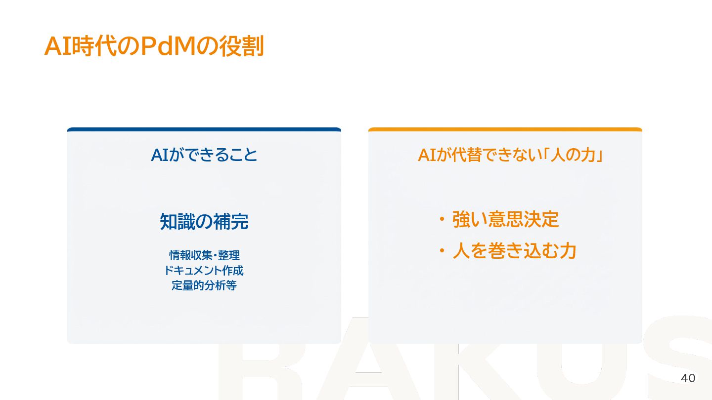 AI時代のPdMの役割 40 AIができること 知識の補完 AIが代替できない「人の力」 ・ 強い意思決定 ・ 人を巻き込む力 情報収集・整理