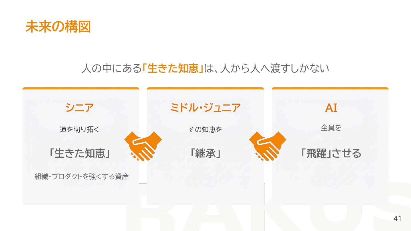 未来の構図 41 シニア 道を切り拓く 「生きた知恵」 組織・プロダクトを強くする資産 ミドル・ジュニア その知恵を 「継承」 AI