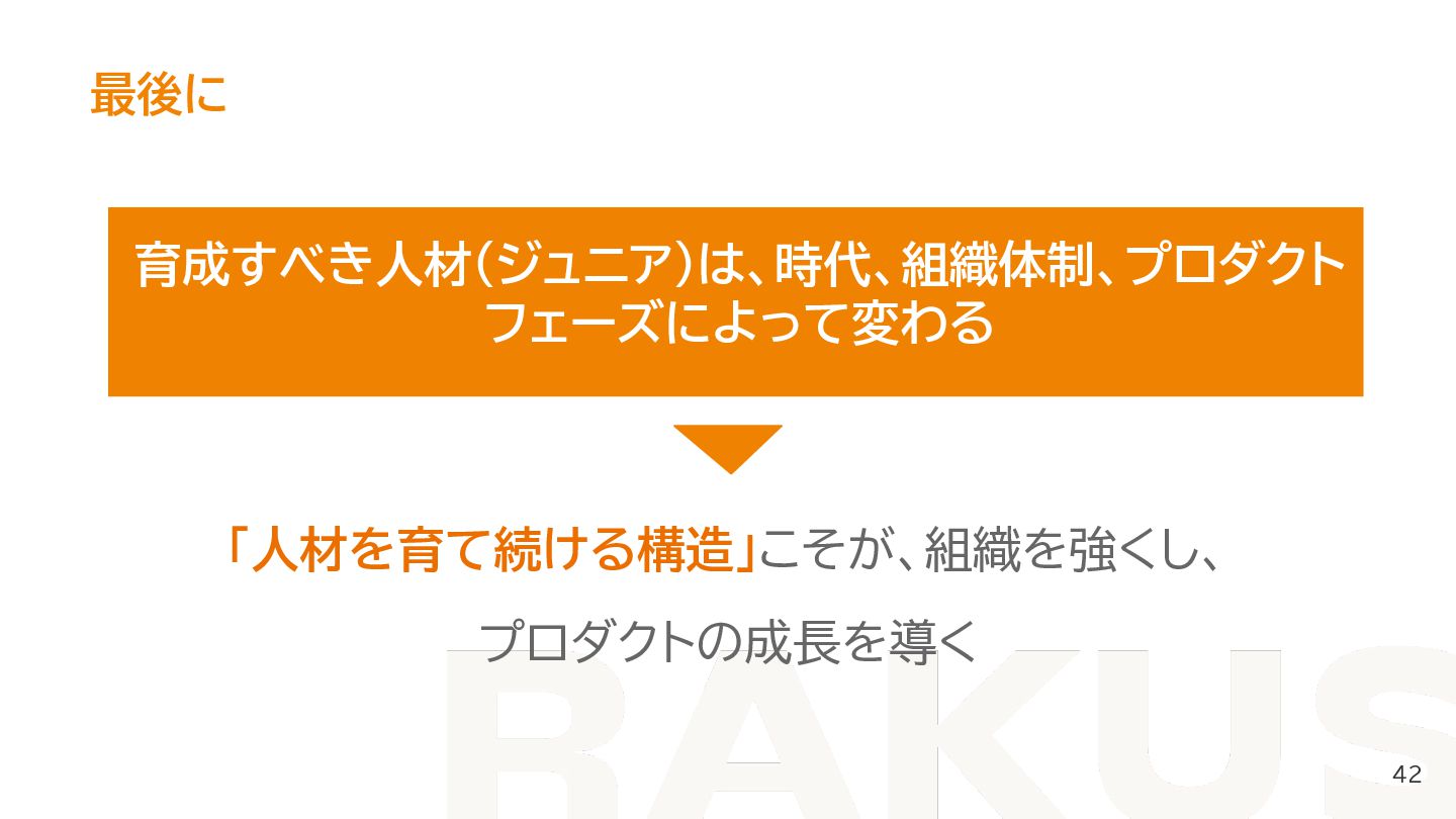 42 「人材を育て続ける構造」こそが、組織を強くし、 プロダクトの成長を導く 育成すべき人材(ジュニア)は、時代、組織体制、プロダクト フェーズによって変わる 最後に