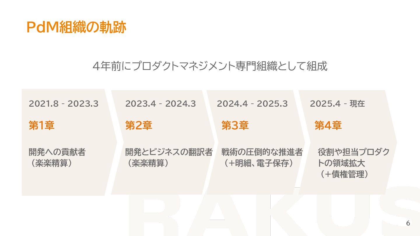 PdM組織の軌跡 6 4年前にプロダクトマネジメント専門組織として組成 2023.4 - 2024.3 第2章 開発とビジネスの翻訳者 (楽楽精算) 2024.4