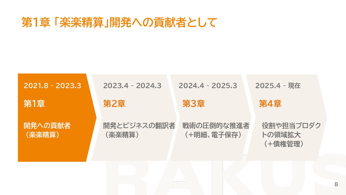 - 2024.3 第2章 開発とビジネスの翻訳者 (楽楽精算) 2024.4 - 2025.3 第3章 戦術の圧倒的な推進者 (+明細、電子保存) 2025.4 - 現在 第4章 役割や担当プロダク トの領域拡大 (+債権管理)