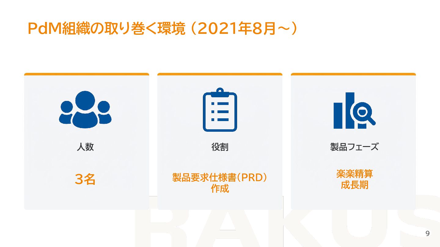 PdM組織の取り巻く環境 (2021年8月〜) 9 人数 3名 役割 製品要求仕様書(PRD) 作成 製品フェーズ 楽楽精算