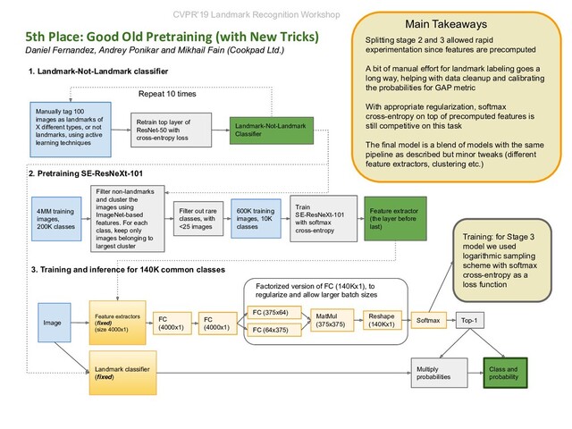 New Tricks) Daniel Fernandez, Andrey Ponikar and Mikhail Fain (Cookpad Ltd.) 1. Landmark-Not-Landmark classifier 2. Pretraining SE-ResNeXt-101 3. Training and inference for 140K common classes Manually tag 100 images as landmarks of X different types, or not landmarks, using active learning techniques Retrain top layer of ResNet-50 with cross-entropy loss Landmark-Not-Landmark Classifier Repeat 10 times 4MM training images, 200K classes Filter out rare classes, with <25 images Filter non-landmarks and cluster the images using ImageNet-based features. For each class, keep only images belonging to largest cluster 600K training images, 10K classes Train SE-ResNeXt-101 with softmax cross-entropy Feature extractor (the layer before last) Image Feature extractors (fixed) (size 4000x1) FC (4000x1) FC (375x64) MatMul (375x375) FC (64x375) Reshape (140Kx1) FC (4000x1) Factorized version of FC (140Kx1), to regularize and allow larger batch sizes Landmark classifier (fixed) Softmax Splitting stage 2 and 3 allowed rapid experimentation since features are precomputed A bit of manual effort for landmark labeling goes a long way, helping with data cleanup and calibrating the probabilities for GAP metric With appropriate regularization, softmax cross-entropy on top of precomputed features is still competitive on this task The final model is a blend of models with the same pipeline as described but minor tweaks (different feature extractors, clustering etc.) Top-1 Multiply probabilities Class and probability Main Takeaways Training: for Stage 3 model we used logarithmic sampling scheme with softmax cross-entropy as a loss function
