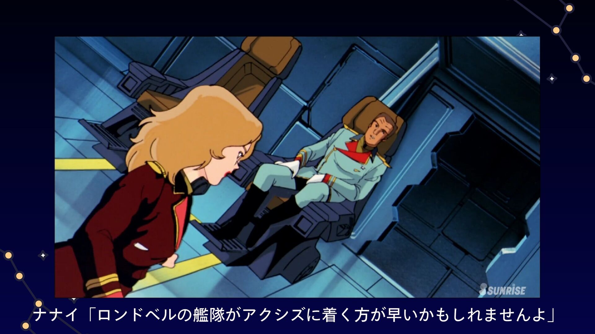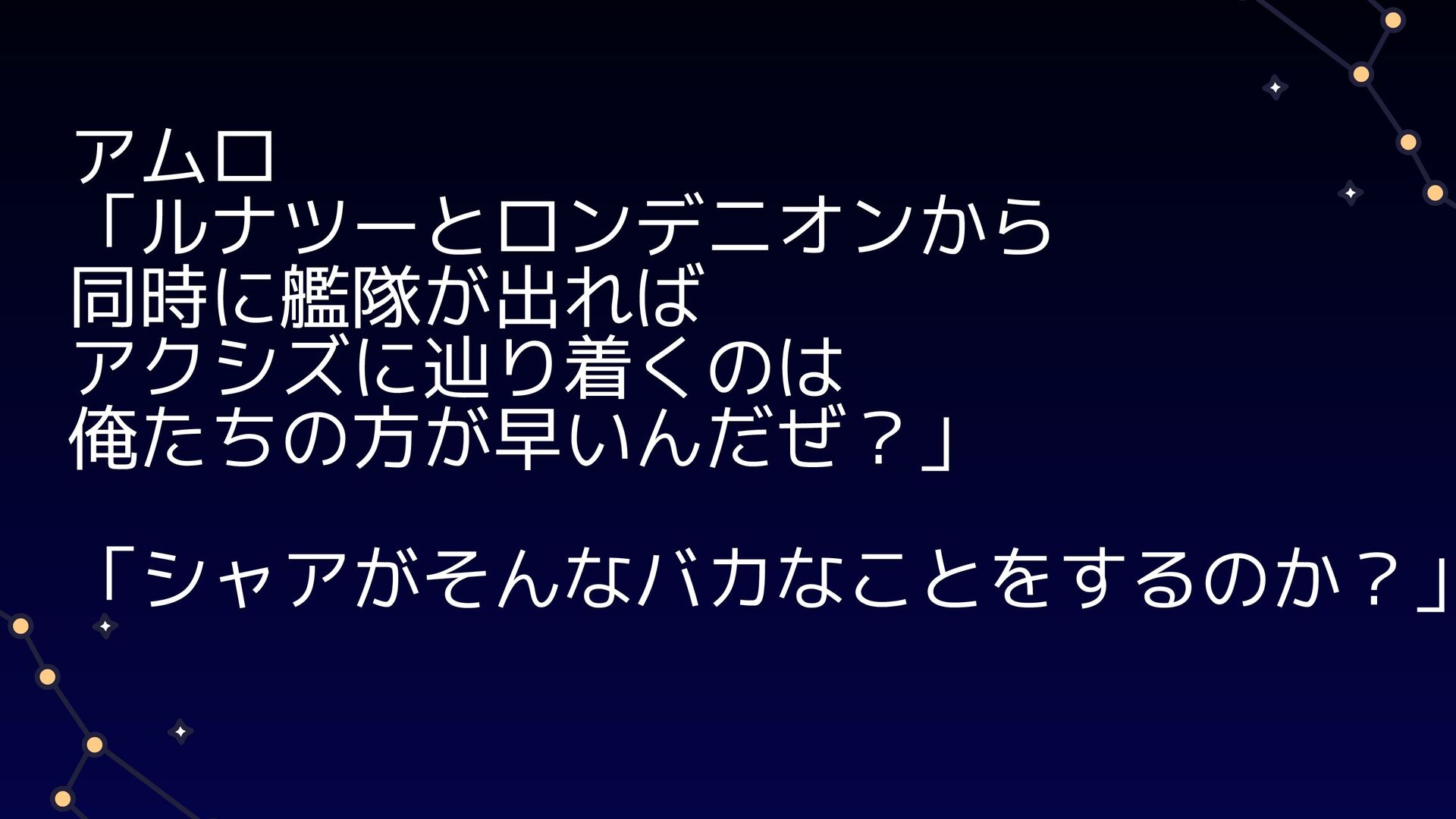 アムロ 「ルナツーとロンデニオンから 同時に艦隊が出れば アクシズに辿り着くのは 俺たちの方が早いんだぜ?」 「シャアがそんなバカなことをするのか?」