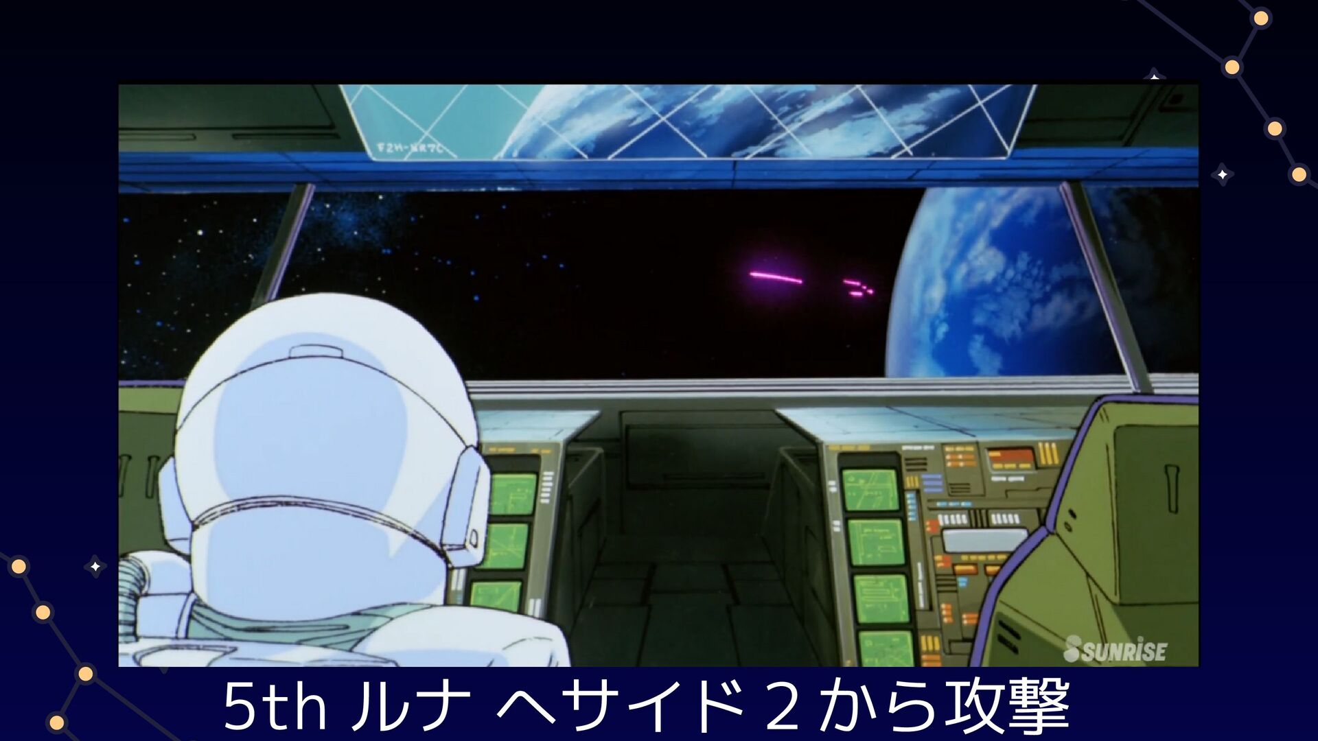 サイド1 ルナツー スイートウォーター ロンデニオン ルナツーを攻撃 核兵器を奪取 報告より1隻多い 旗艦はダミー ダミーのレウルーラを 見送りアクシズへ