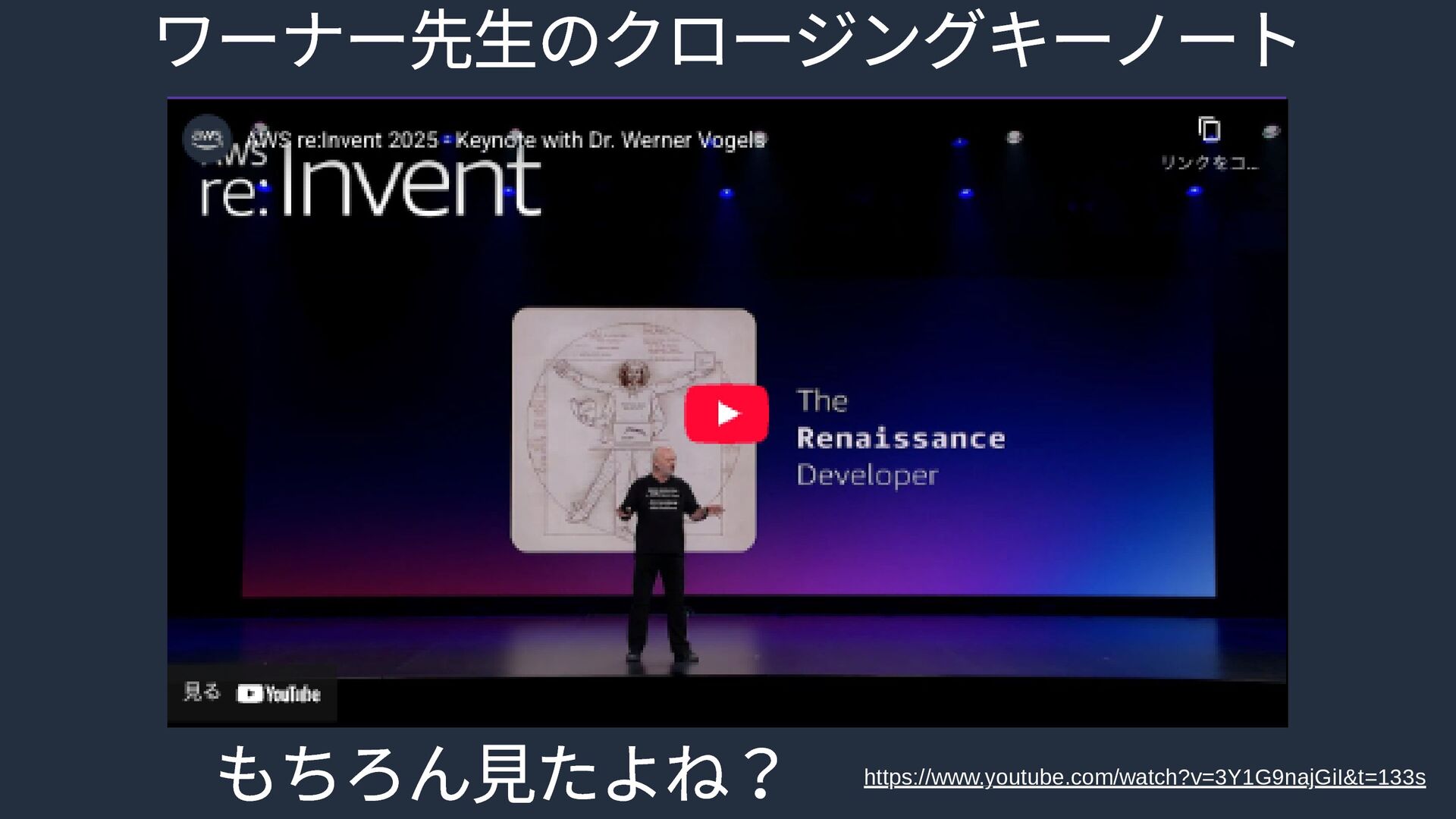 AWS re:Invent 2025 で行われた Dr. Werner Vogels の最後のクロージングキーノートを、エンタメ視点で深掘りするライトニングトーク資料です。