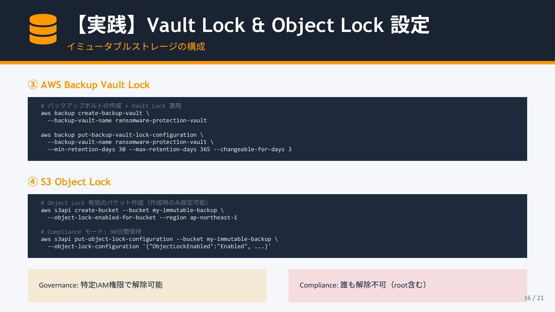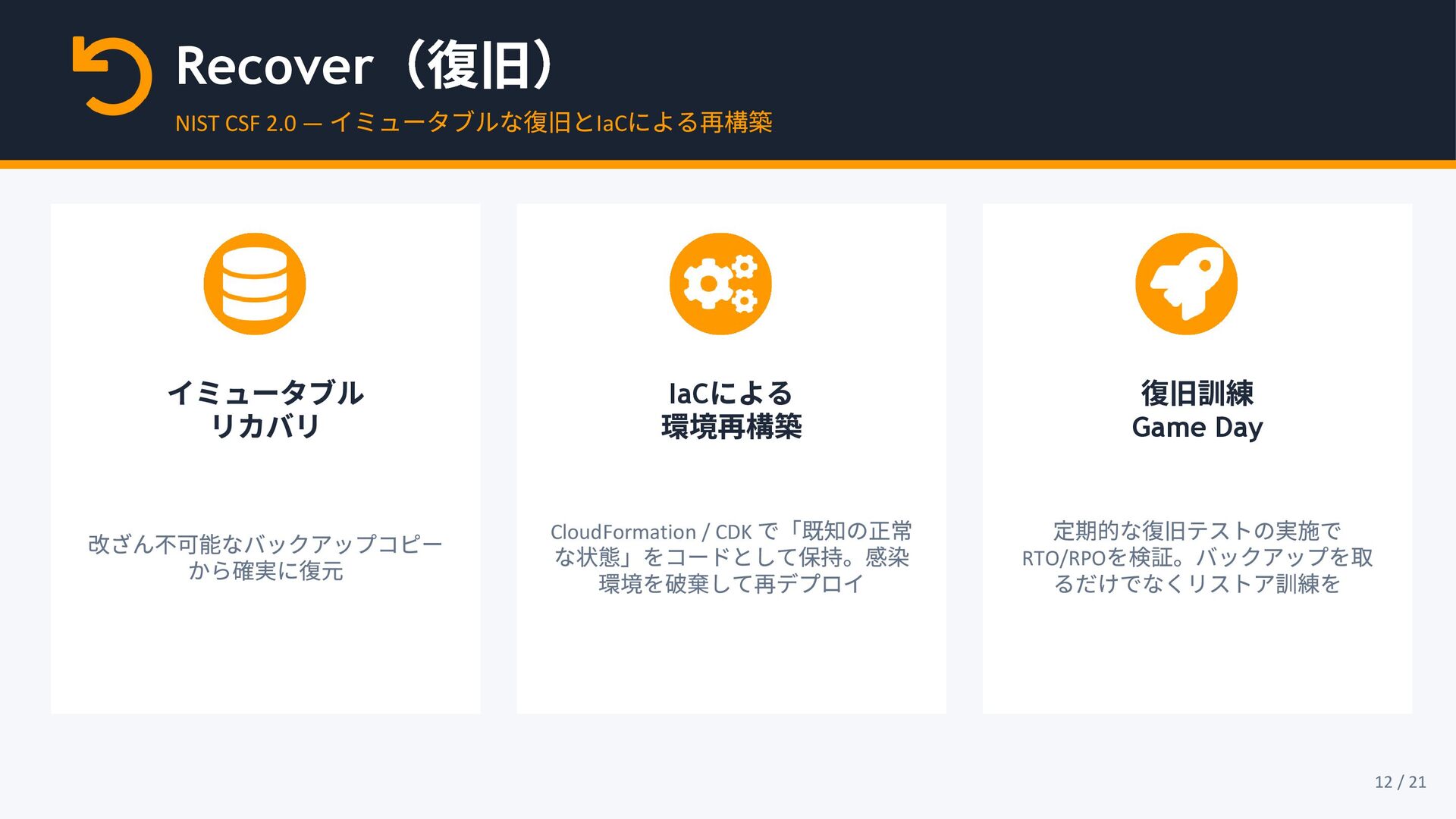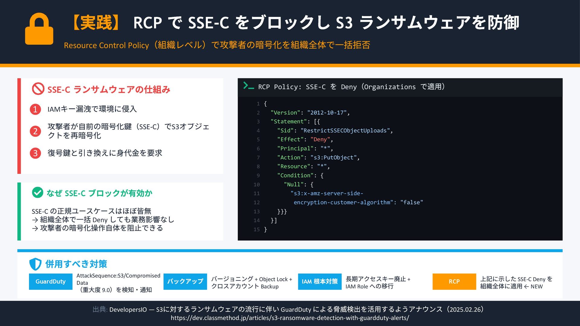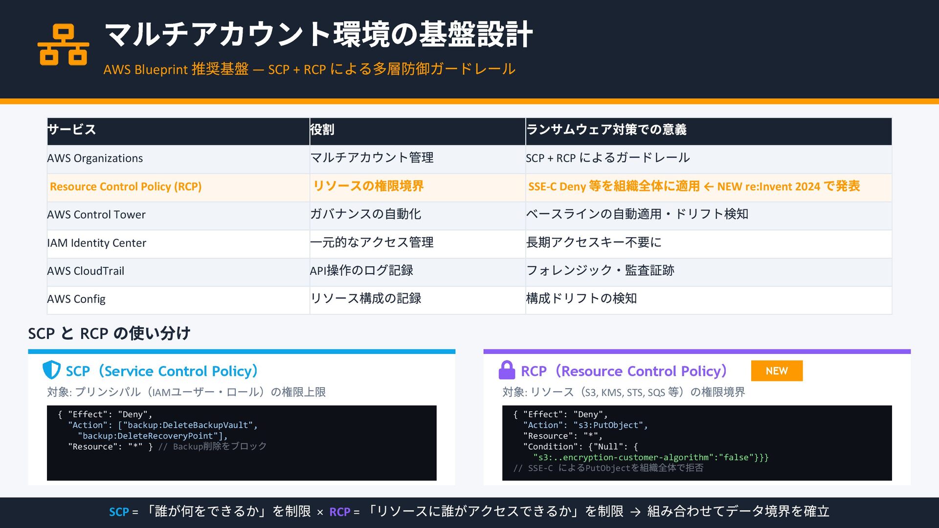 役割 ランサムウェア対策での意義 AWS Organizations マルチアカウント管理 SCP + RCP によるガードレール Resource Control Policy (RCP) リソースの権限境界 SSE-C Deny 等を組織全体に適用 ← NEW re:Invent 2024 で発表 AWS Control Tower ガバナンスの自動化 ベースラインの自動適用・ドリフト検知 IAM Identity Center 一元的なアクセス管理 長期アクセスキー不要に AWS CloudTrail API 操作のログ記録 フォレンジック・監査証跡 AWS Config リソース構成の記録 構成ドリフトの検知 SCP と RCP の使い分け SCP (Service Control Policy ) 対象: プリンシパル(IAM ユーザー・ロール)の権限上限 { "Effect": "Deny", "Action": ["backup:DeleteBackupVault", "backup:DeleteRecoveryPoint"], "Resource": "*" } // Backup 削除をブロック RCP (Resource Control Policy ) NEW 対象: リソース(S3, KMS, STS, SQS 等)の権限境界 { "Effect": "Deny", "Action": "s3:PutObject", "Resource": "*", "Condition": {"Null": { "s3:..encryption-customer-algorithm":"false"}}} // SSE-C によるPutObject を組織全体で拒否 SCP = 「誰が何をできるか」を制限 × RCP = 「リソースに誰がアクセスできるか」を制限 → 組み合わせてデータ境界を確立