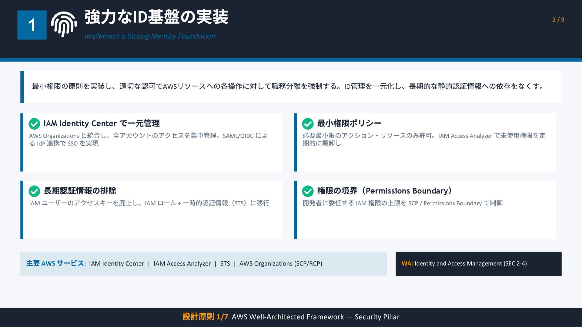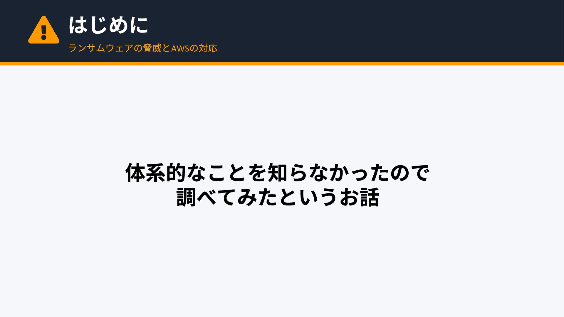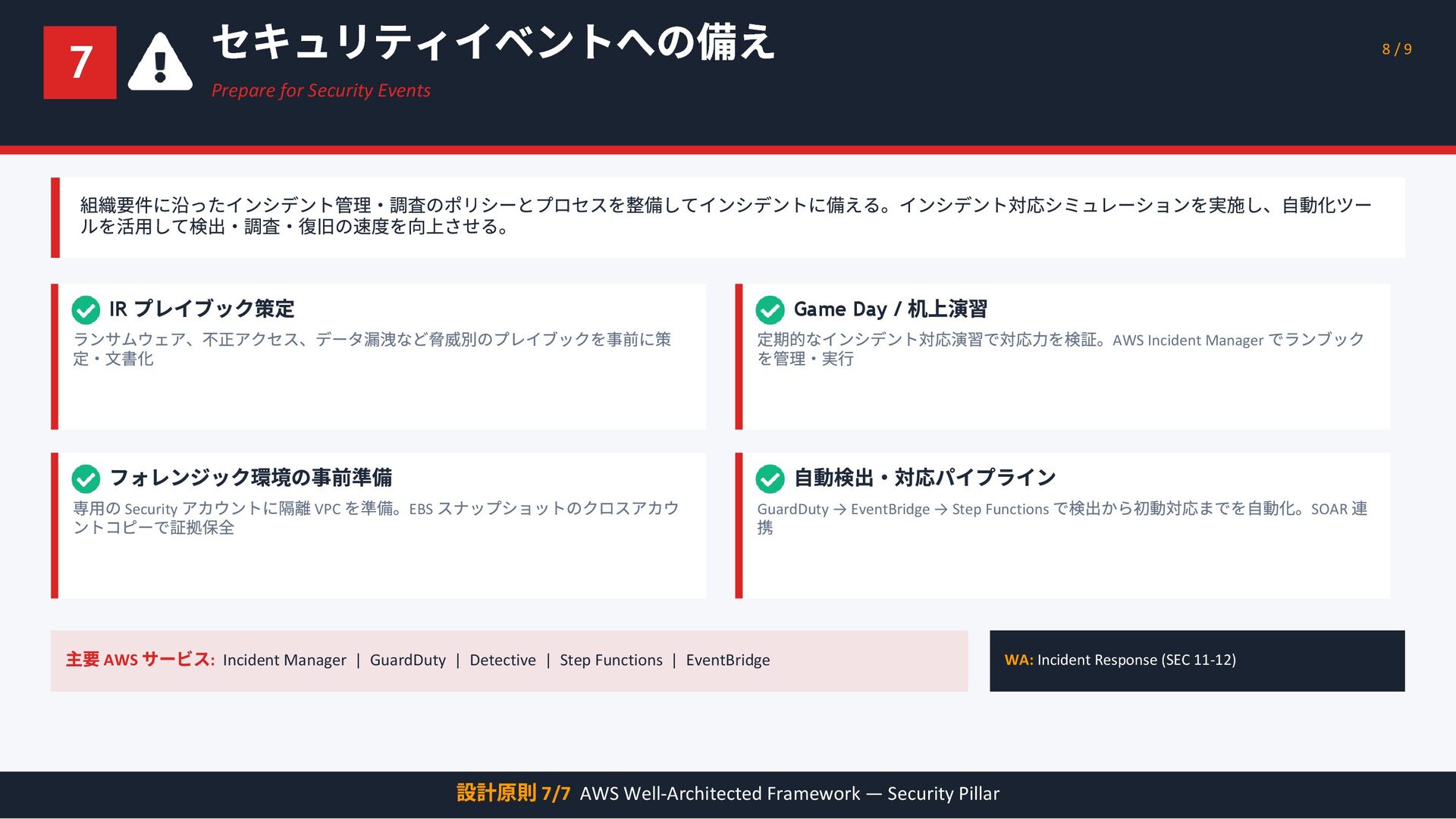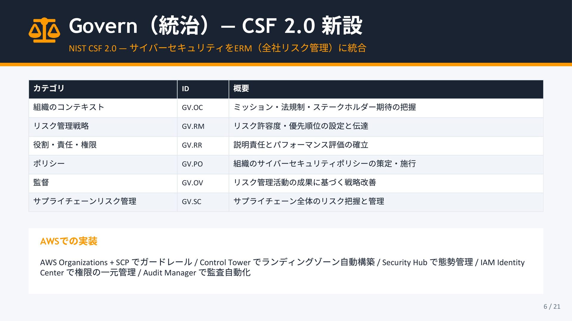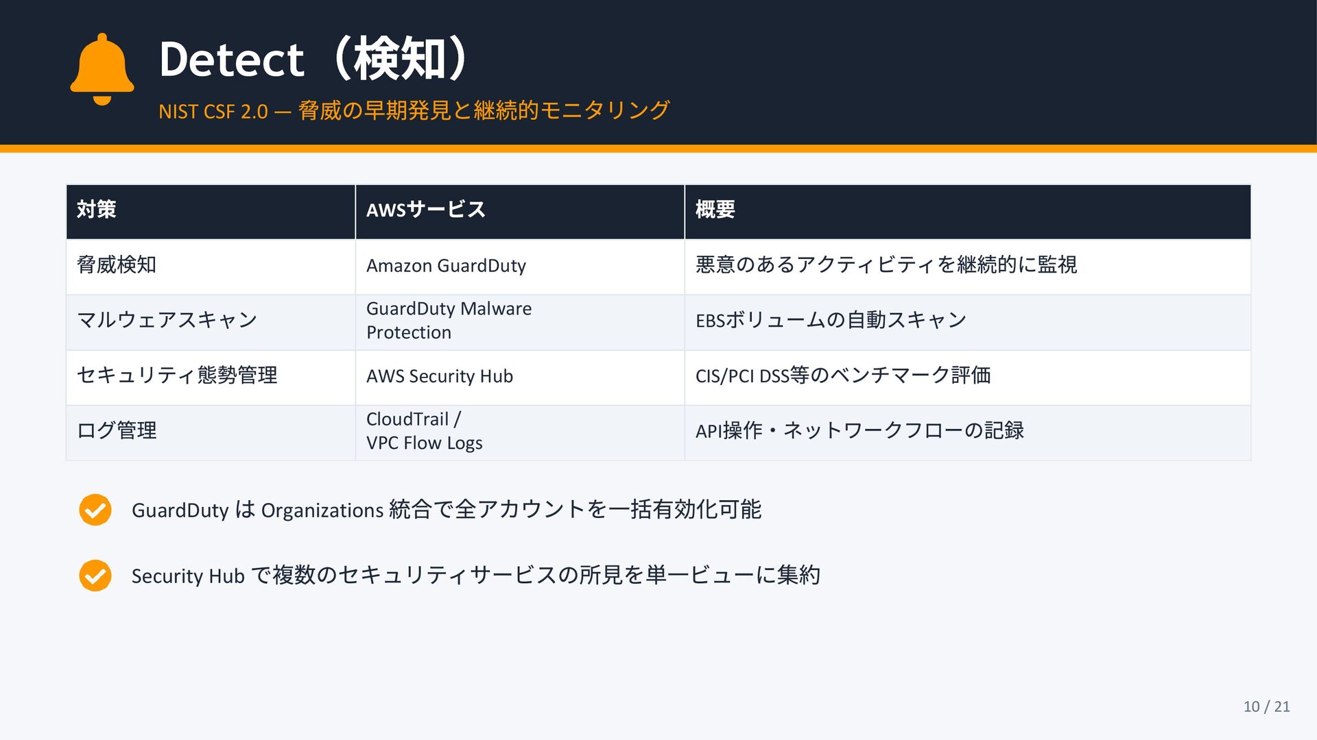 役割 ランサムウェア対策での意義 AWS Organizations マルチアカウント管理 SCP + RCP によるガードレール Resource Control Policy (RCP) リソースの権限境界 SSE-C Deny 等を組織全体に適用 ← NEW re:Invent 2024 で発表 AWS Control Tower ガバナンスの自動化 ベースラインの自動適用・ドリフト検知 IAM Identity Center 一元的なアクセス管理 長期アクセスキー不要に AWS CloudTrail API 操作のログ記録 フォレンジック・監査証跡 AWS Config リソース構成の記録 構成ドリフトの検知 SCP と RCP の使い分け SCP (Service Control Policy ) 対象: プリンシパル(IAM ユーザー・ロール)の権限上限 { "Effect": "Deny", "Action": ["backup:DeleteBackupVault", "backup:DeleteRecoveryPoint"], "Resource": "*" } // Backup 削除をブロック RCP (Resource Control Policy ) NEW 対象: リソース(S3, KMS, STS, SQS 等)の権限境界 { "Effect": "Deny", "Action": "s3:PutObject", "Resource": "*", "Condition": {"Null": { "s3:..encryption-customer-algorithm":"false"}}} // SSE-C によるPutObject を組織全体で拒否 SCP = 「誰が何をできるか」を制限 × RCP = 「リソースに誰がアクセスできるか」を制限 → 組み合わせてデータ境界を確立