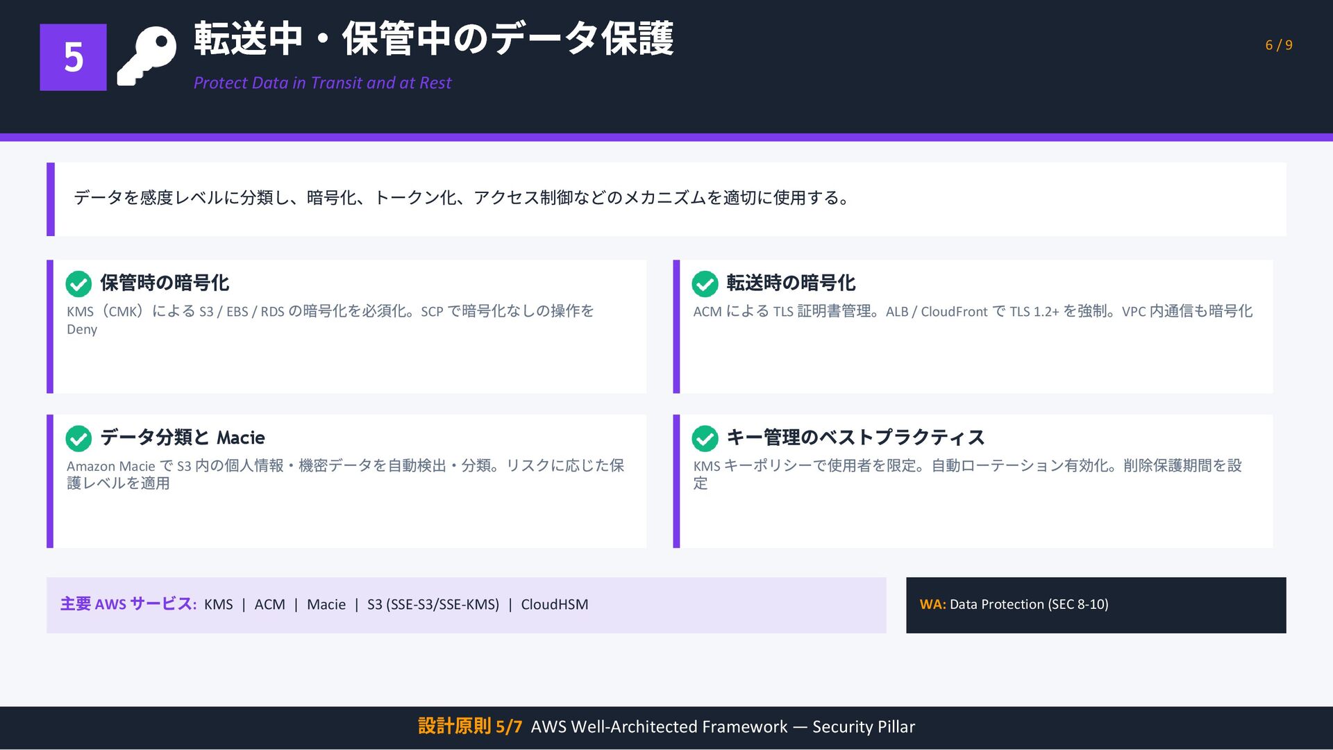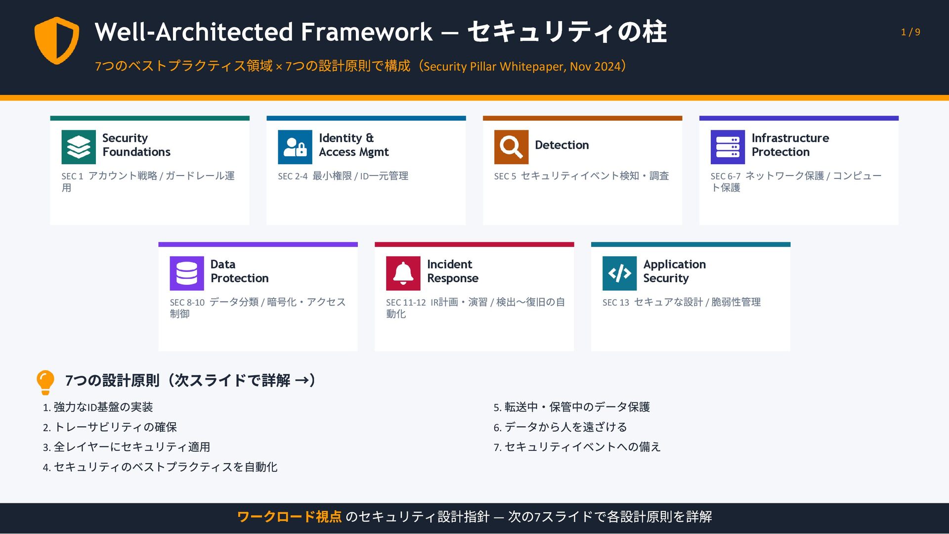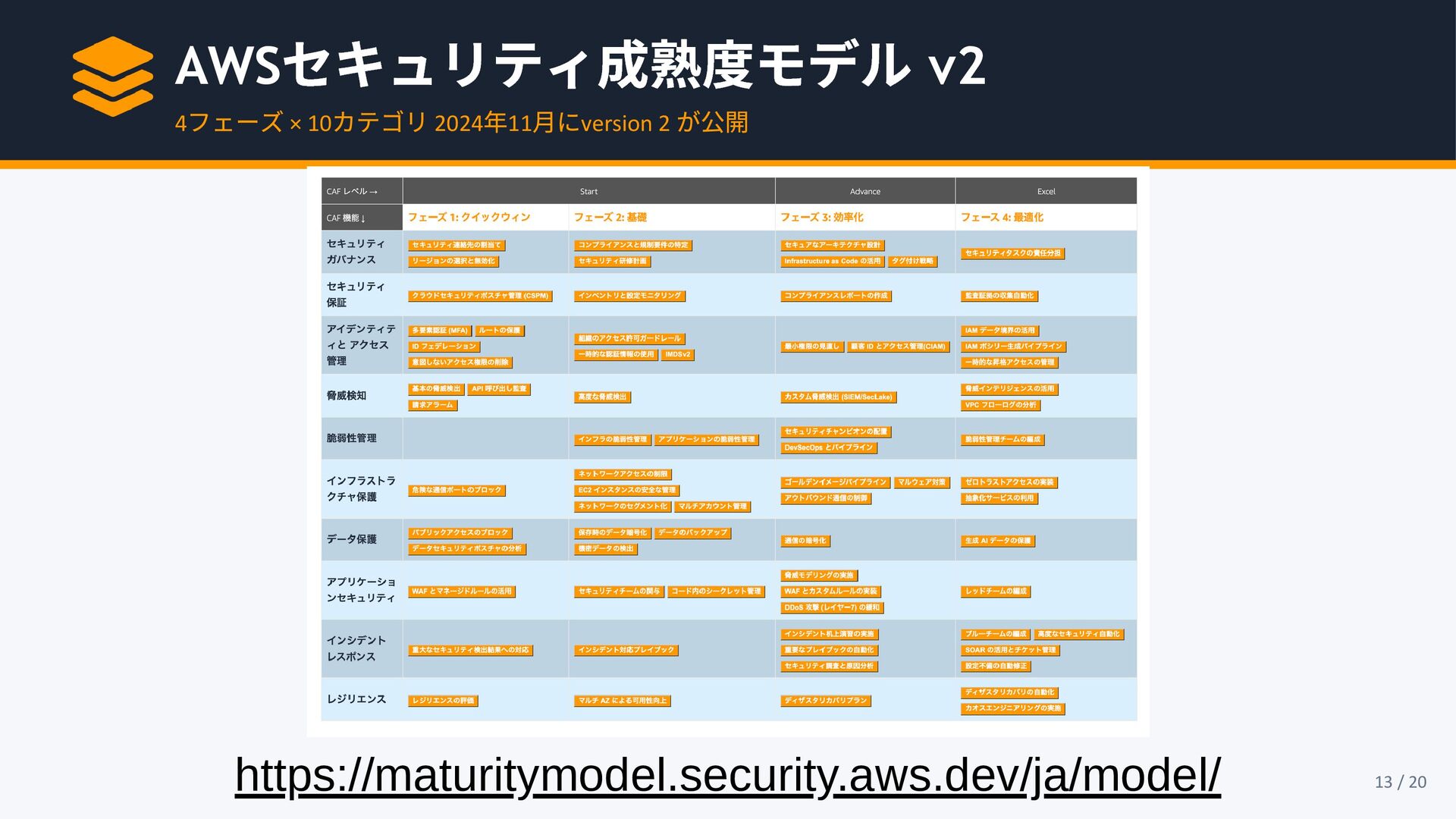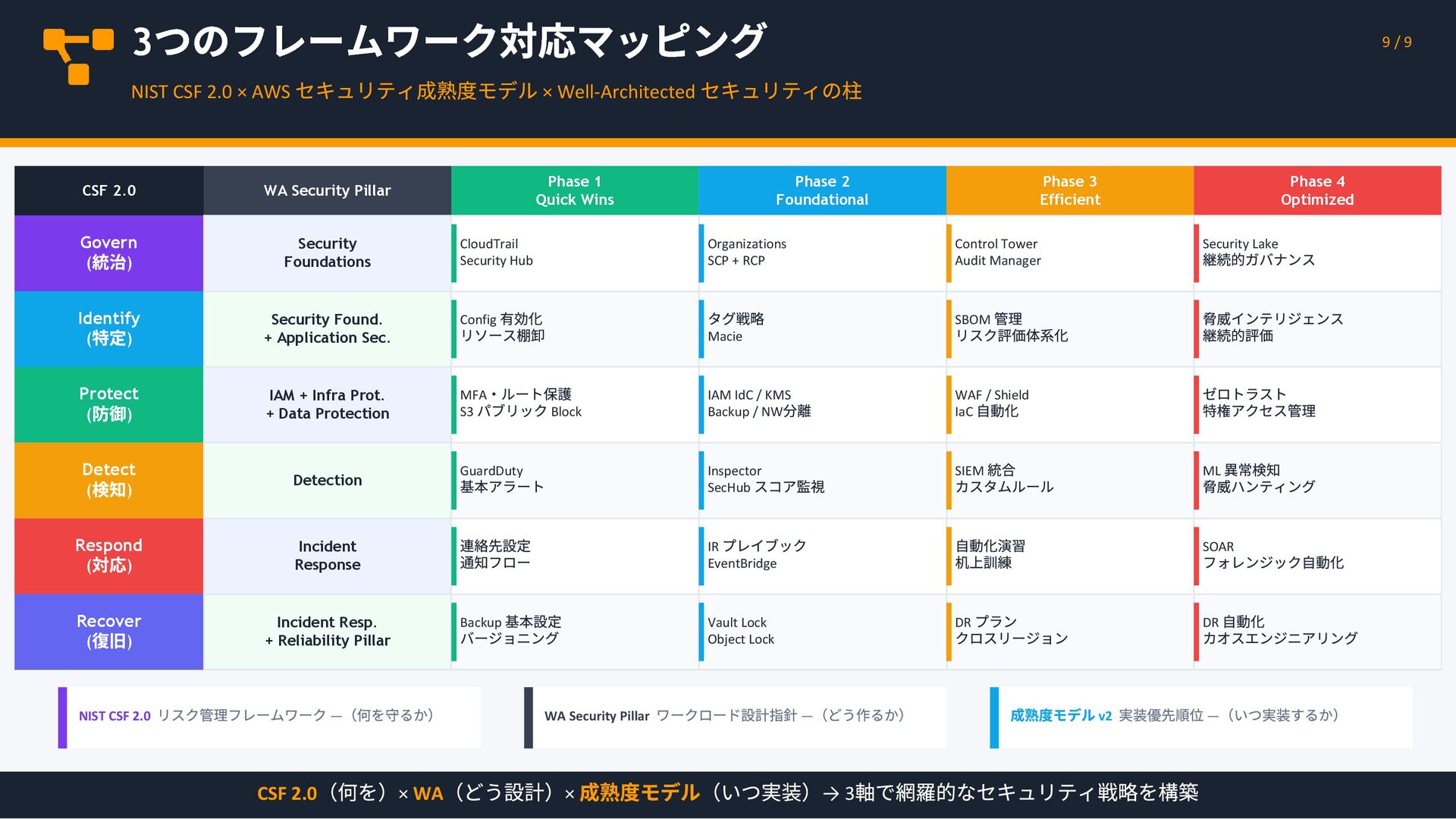 役割 ランサムウェア対策での意義 AWS Organizations マルチアカウント管理 SCP + RCP によるガードレール Resource Control Policy (RCP) リソースの権限境界 SSE-C Deny 等を組織全体に適用 ← NEW re:Invent 2024 で発表 AWS Control Tower ガバナンスの自動化 ベースラインの自動適用・ドリフト検知 IAM Identity Center 一元的なアクセス管理 長期アクセスキー不要に AWS CloudTrail API 操作のログ記録 フォレンジック・監査証跡 AWS Config リソース構成の記録 構成ドリフトの検知 SCP と RCP の使い分け SCP (Service Control Policy ) 対象: プリンシパル(IAM ユーザー・ロール)の権限上限 { "Effect": "Deny", "Action": ["backup:DeleteBackupVault", "backup:DeleteRecoveryPoint"], "Resource": "*" } // Backup 削除をブロック RCP (Resource Control Policy ) NEW 対象: リソース(S3, KMS, STS, SQS 等)の権限境界 { "Effect": "Deny", "Action": "s3:PutObject", "Resource": "*", "Condition": {"Null": { "s3:..encryption-customer-algorithm":"false"}}} // SSE-C によるPutObject を組織全体で拒否 SCP = 「誰が何をできるか」を制限 × RCP = 「リソースに誰がアクセスできるか」を制限 → 組み合わせてデータ境界を確立
