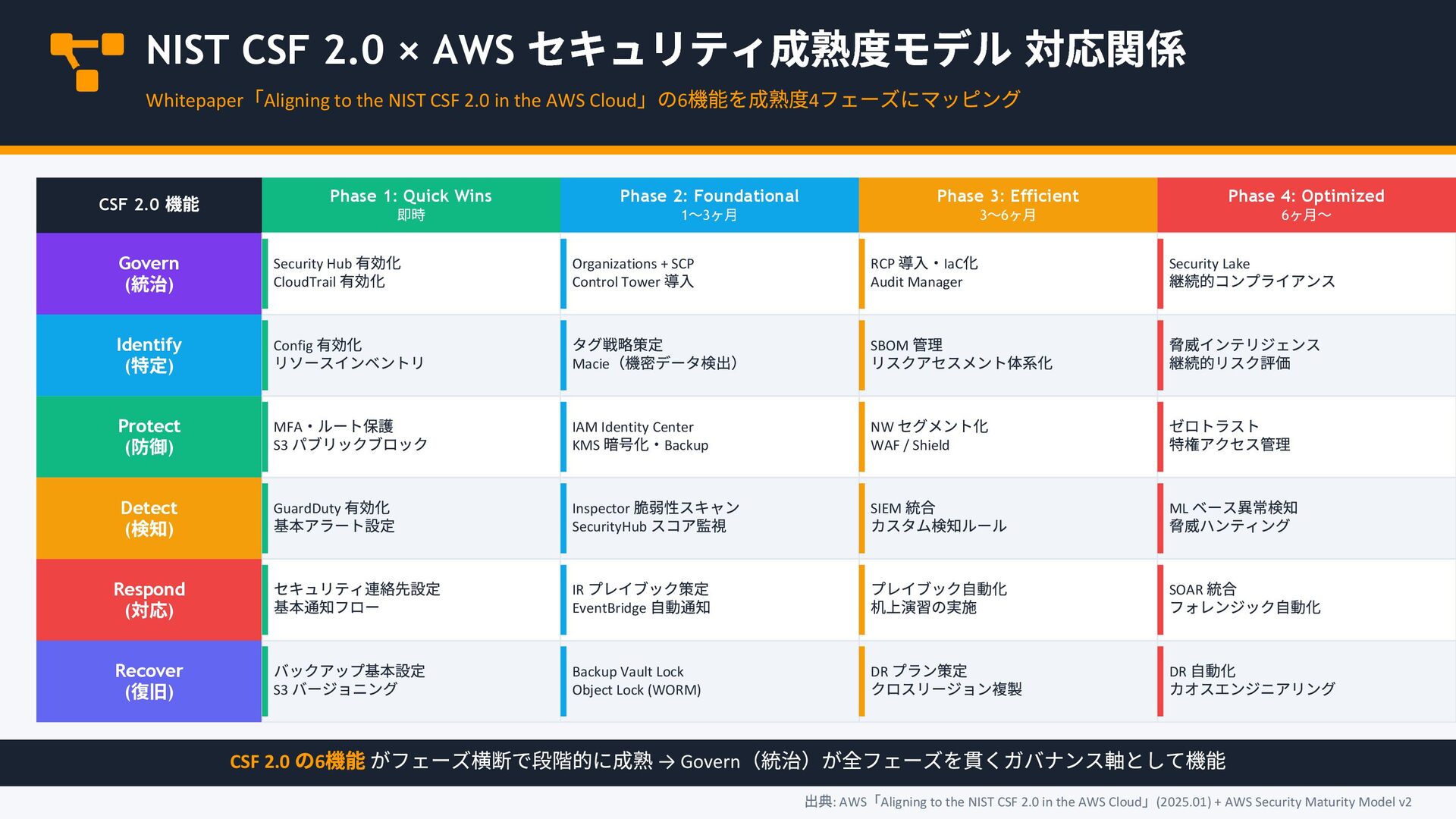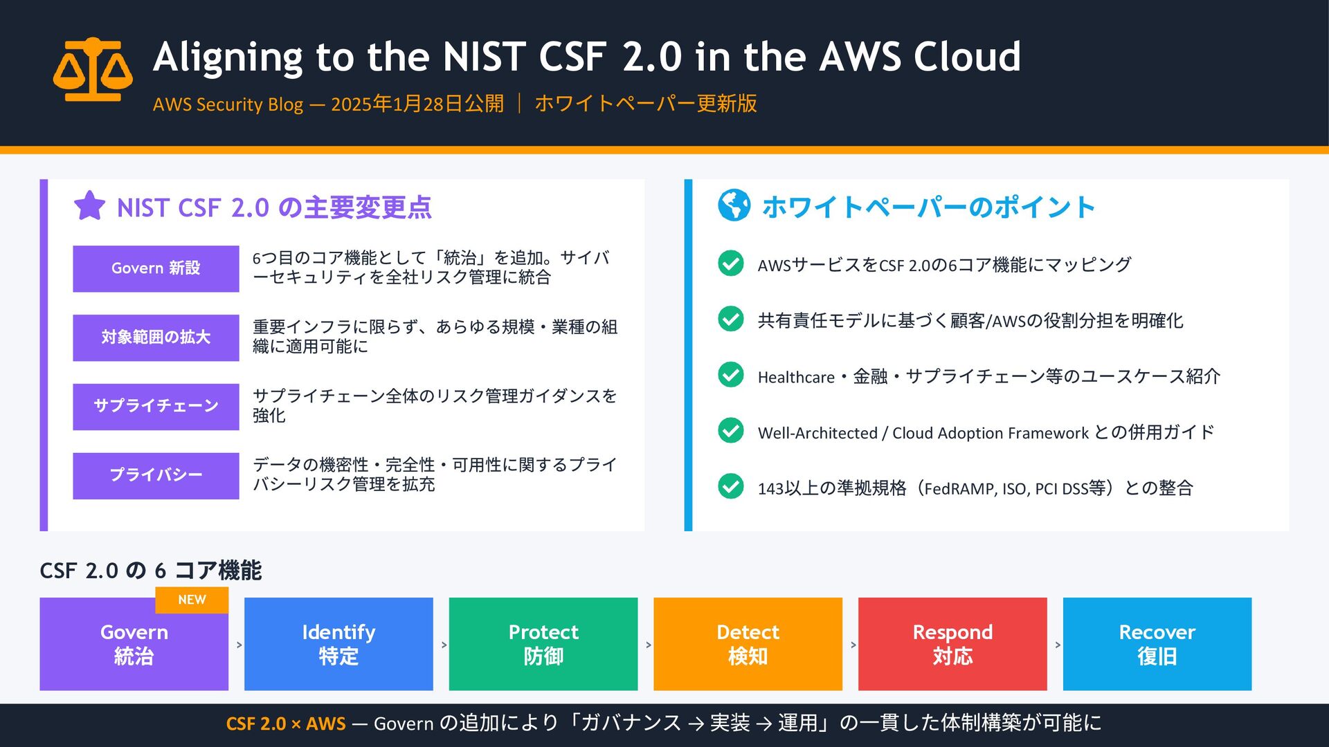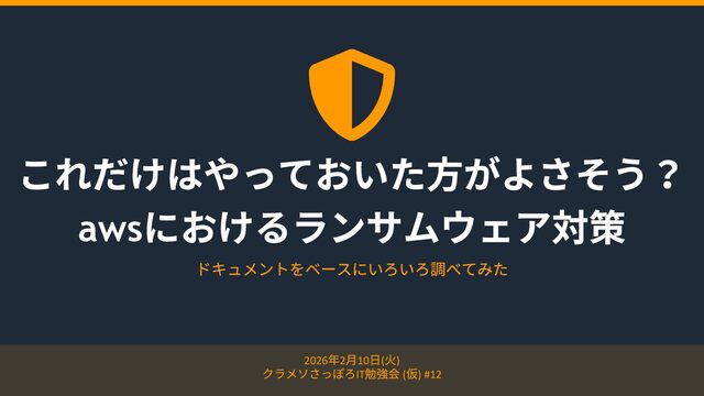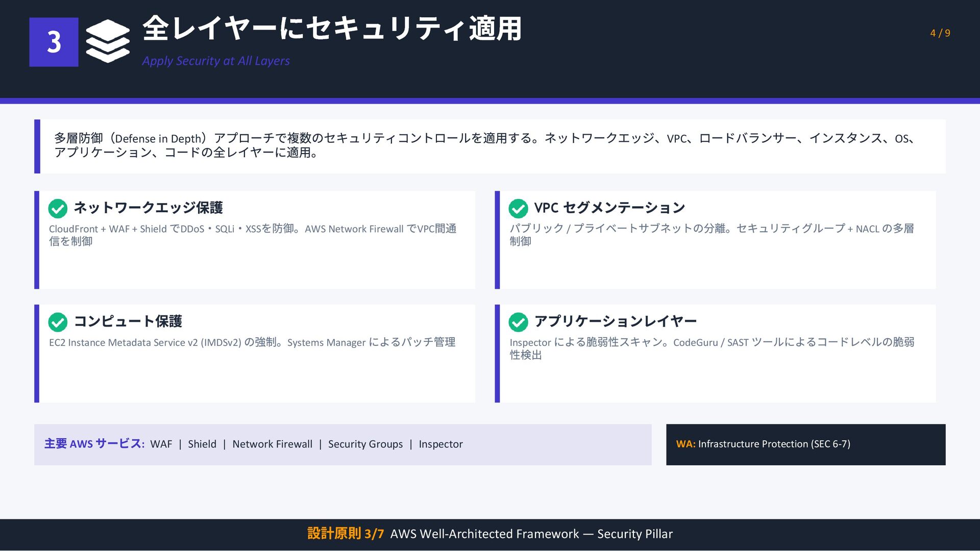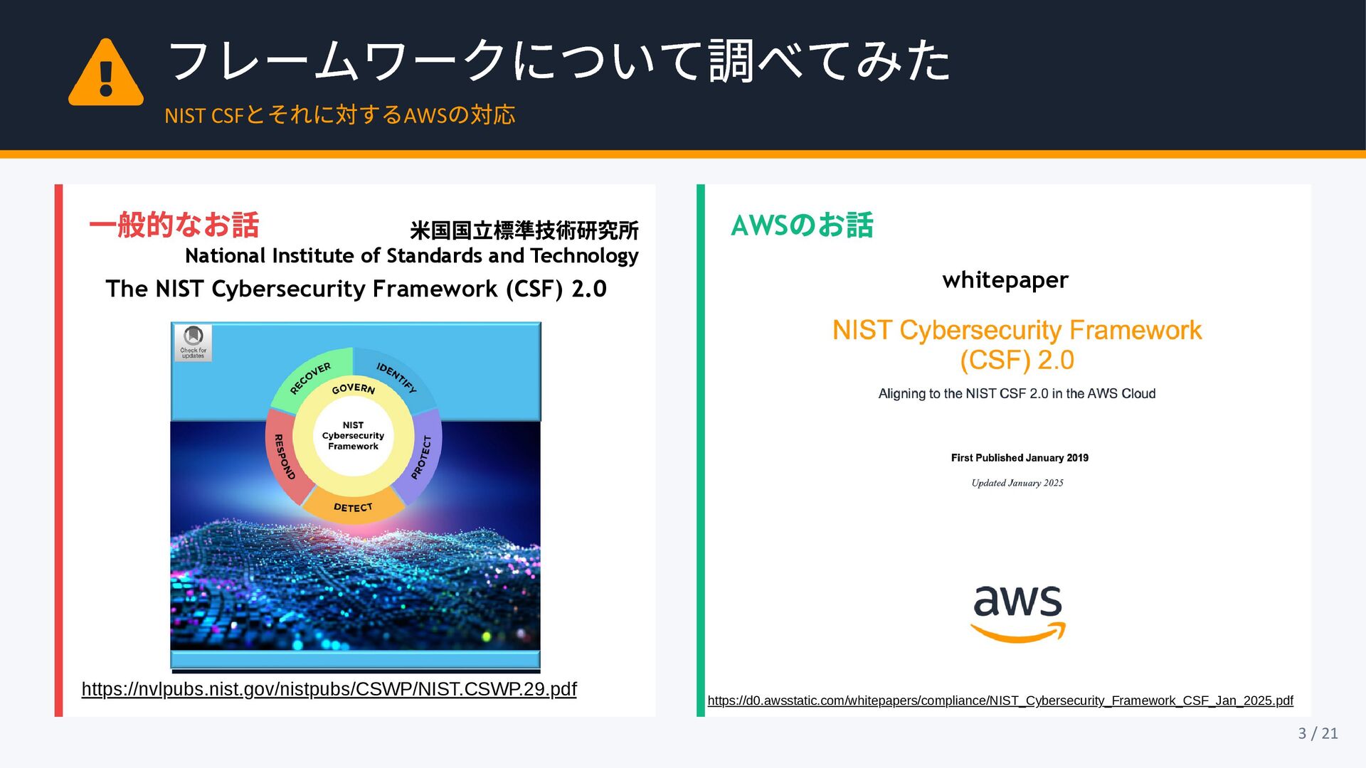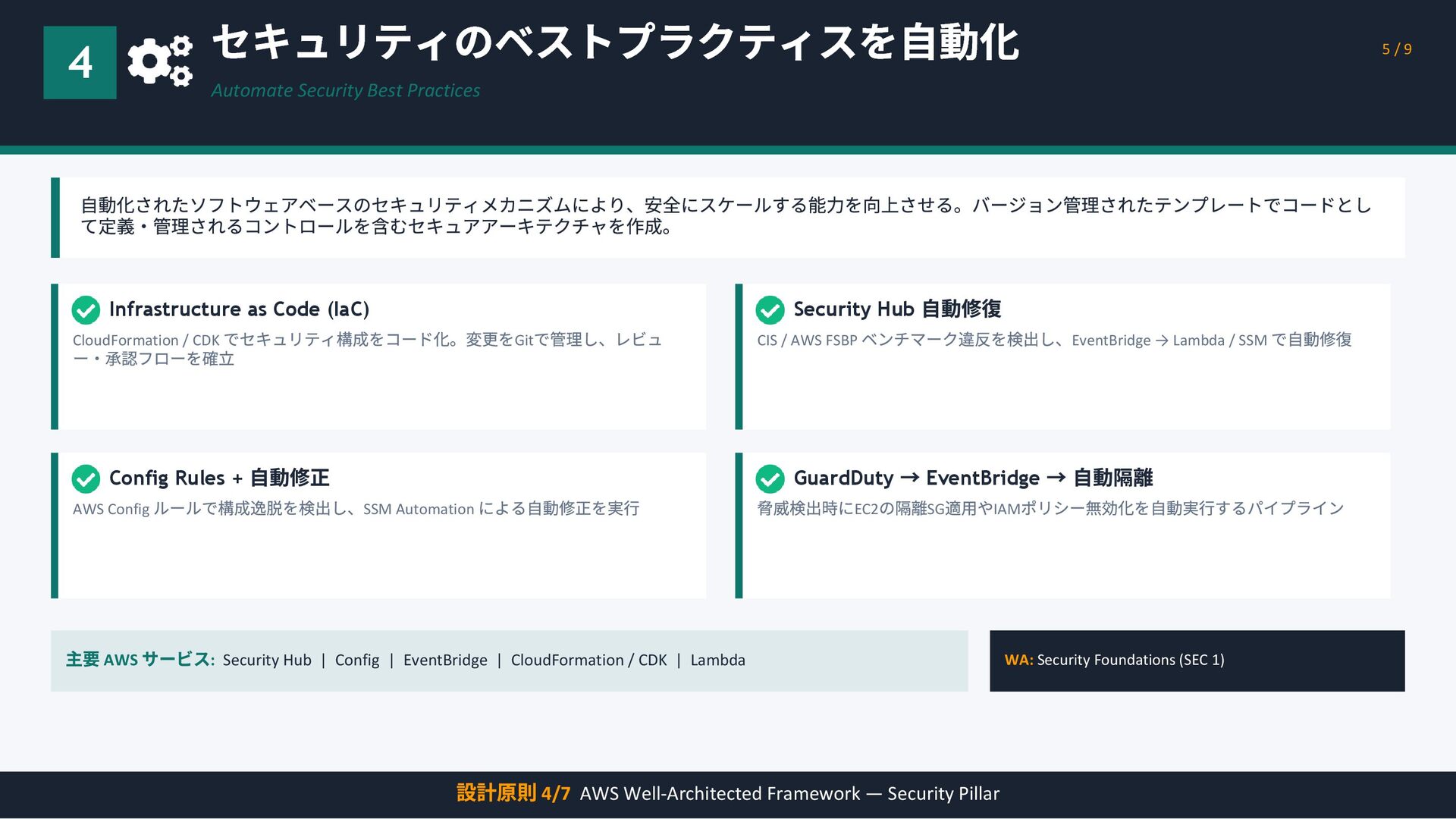 役割 ランサムウェア対策での意義 AWS Organizations マルチアカウント管理 SCP + RCP によるガードレール Resource Control Policy (RCP) リソースの権限境界 SSE-C Deny 等を組織全体に適用 ← NEW re:Invent 2024 で発表 AWS Control Tower ガバナンスの自動化 ベースラインの自動適用・ドリフト検知 IAM Identity Center 一元的なアクセス管理 長期アクセスキー不要に AWS CloudTrail API 操作のログ記録 フォレンジック・監査証跡 AWS Config リソース構成の記録 構成ドリフトの検知 SCP と RCP の使い分け SCP (Service Control Policy ) 対象: プリンシパル(IAM ユーザー・ロール)の権限上限 { "Effect": "Deny", "Action": ["backup:DeleteBackupVault", "backup:DeleteRecoveryPoint"], "Resource": "*" } // Backup 削除をブロック RCP (Resource Control Policy ) NEW 対象: リソース(S3, KMS, STS, SQS 等)の権限境界 { "Effect": "Deny", "Action": "s3:PutObject", "Resource": "*", "Condition": {"Null": { "s3:..encryption-customer-algorithm":"false"}}} // SSE-C によるPutObject を組織全体で拒否 SCP = 「誰が何をできるか」を制限 × RCP = 「リソースに誰がアクセスできるか」を制限 → 組み合わせてデータ境界を確立