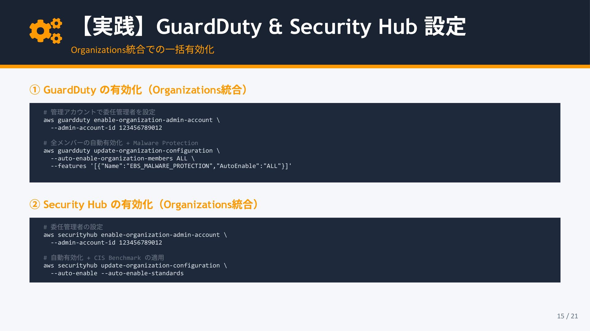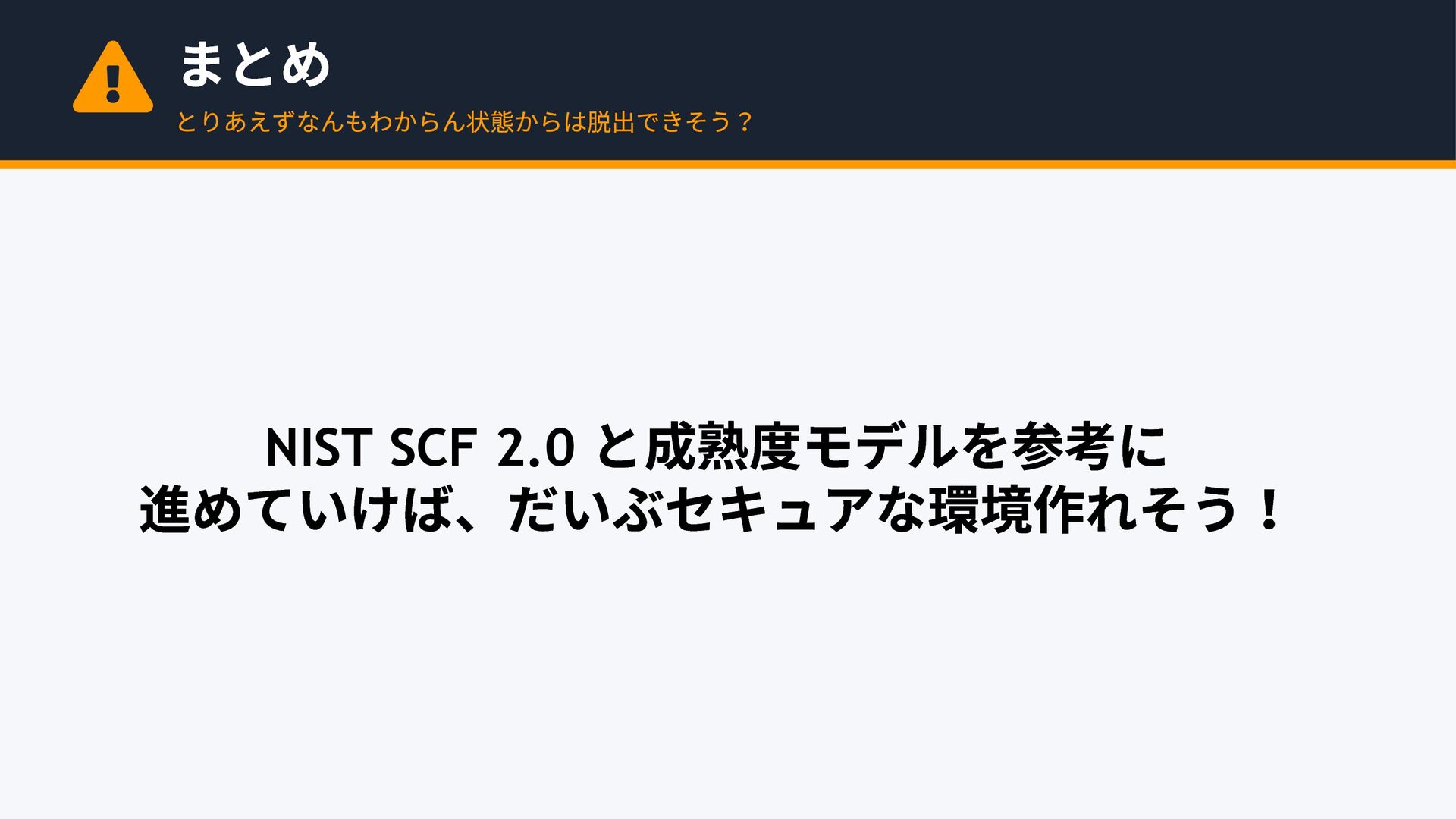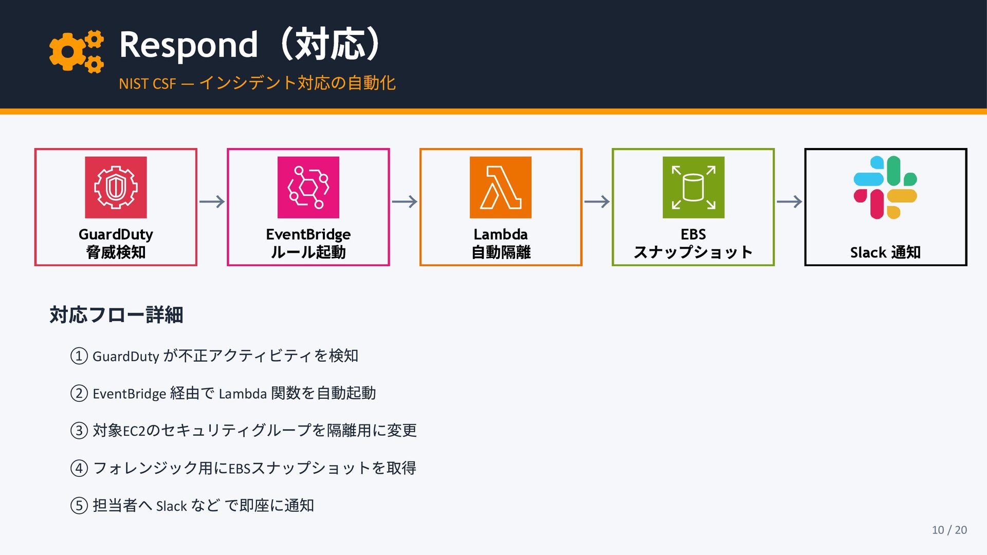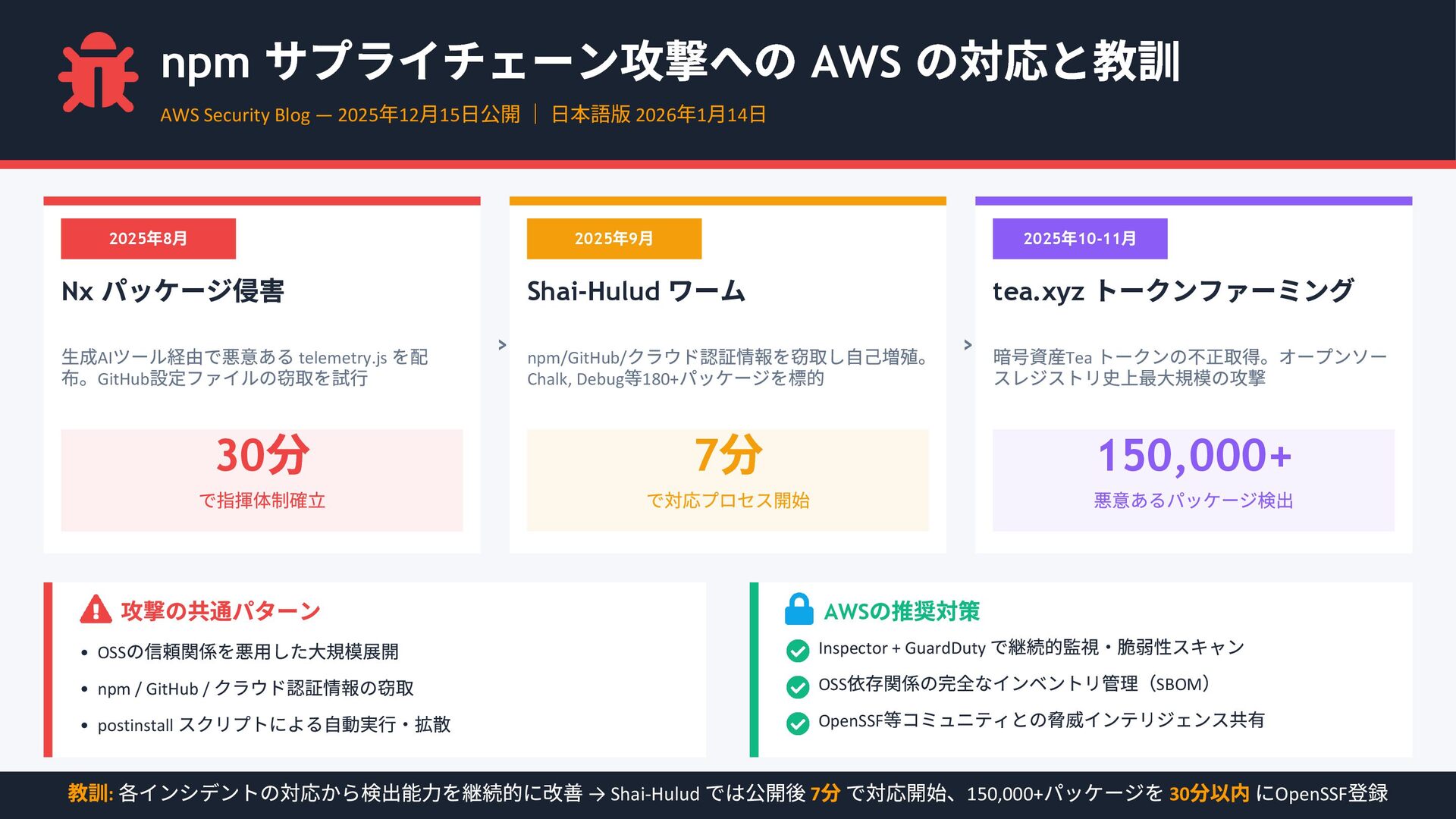 役割 ランサムウェア対策での意義 AWS Organizations マルチアカウント管理 SCP + RCP によるガードレール Resource Control Policy (RCP) リソースの権限境界 SSE-C Deny 等を組織全体に適用 ← NEW re:Invent 2024 で発表 AWS Control Tower ガバナンスの自動化 ベースラインの自動適用・ドリフト検知 IAM Identity Center 一元的なアクセス管理 長期アクセスキー不要に AWS CloudTrail API 操作のログ記録 フォレンジック・監査証跡 AWS Config リソース構成の記録 構成ドリフトの検知 SCP と RCP の使い分け SCP (Service Control Policy ) 対象: プリンシパル(IAM ユーザー・ロール)の権限上限 { "Effect": "Deny", "Action": ["backup:DeleteBackupVault", "backup:DeleteRecoveryPoint"], "Resource": "*" } // Backup 削除をブロック RCP (Resource Control Policy ) NEW 対象: リソース(S3, KMS, STS, SQS 等)の権限境界 { "Effect": "Deny", "Action": "s3:PutObject", "Resource": "*", "Condition": {"Null": { "s3:..encryption-customer-algorithm":"false"}}} // SSE-C によるPutObject を組織全体で拒否 SCP = 「誰が何をできるか」を制限 × RCP = 「リソースに誰がアクセスできるか」を制限 → 組み合わせてデータ境界を確立