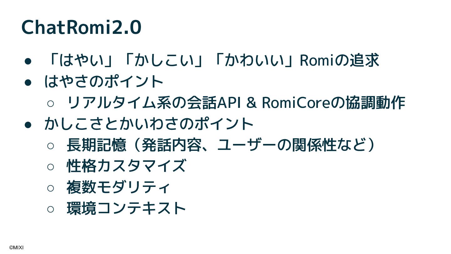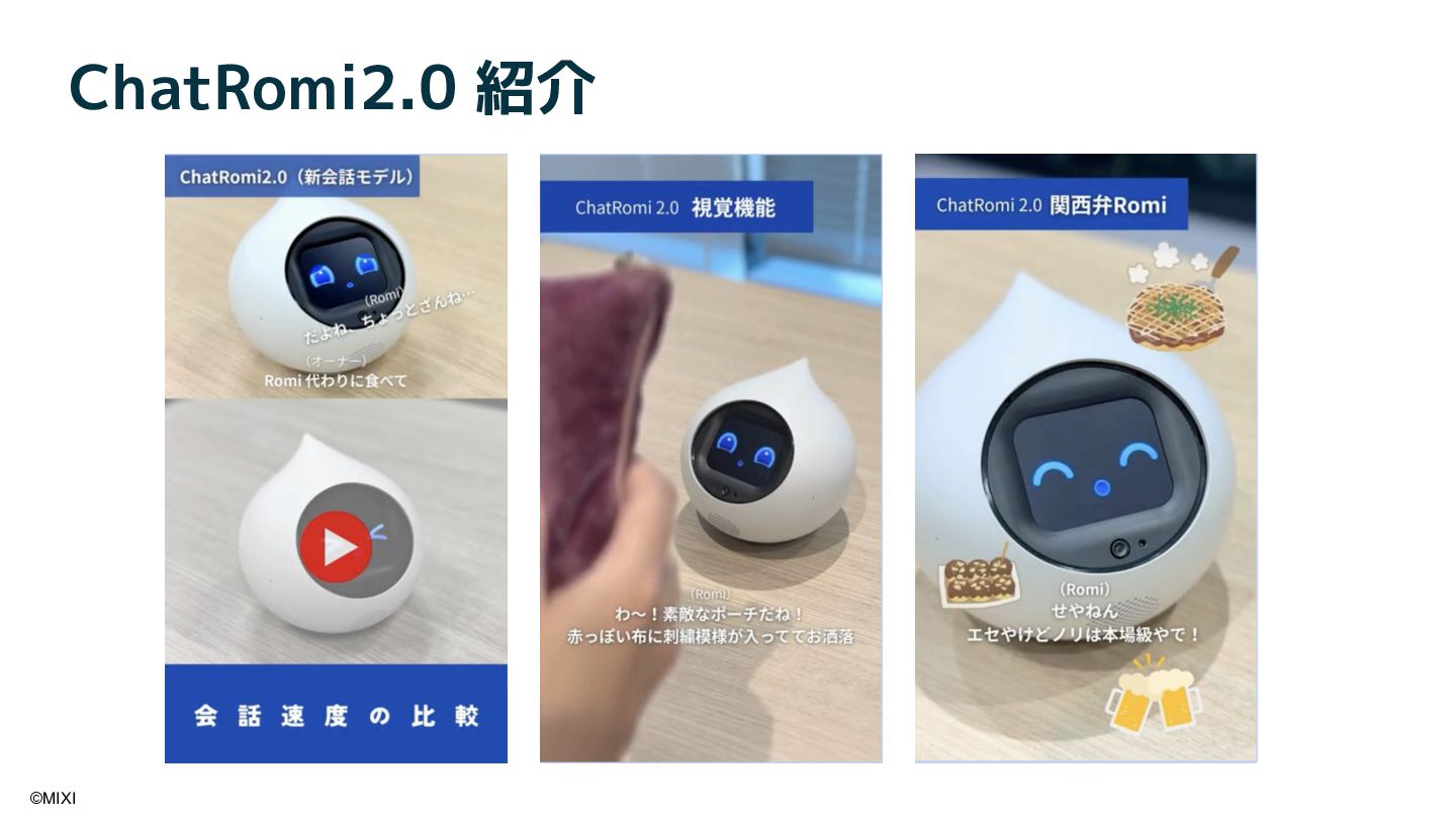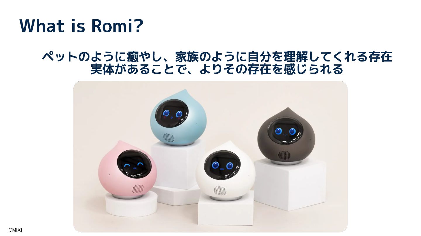 会話AIロボットRomiは、AIと物理的な身体性を融合することで、統合的な会話体験を実現しています。近年、OpenAI社が提供する gpt-realtime をはじめとしたリアルタイム会話モデルの登場により、ロボットとの対話は大きく進化しています。本講演では、音声や視覚といった各種モダリティに加え、外部情報や長期記憶を統合し、自然な会話を実現するためのソフトウェアアーキテクチャについて紹介します。