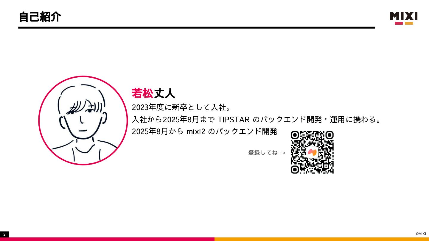 ©MIXI 2 自己紹介 2023年度に新卒として入社。 入社から2025年8月まで TIPSTAR のバックエンド開発・運用に携わる。 2025年8月から mixi2 のバックエンド開発