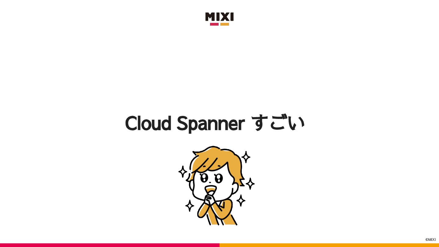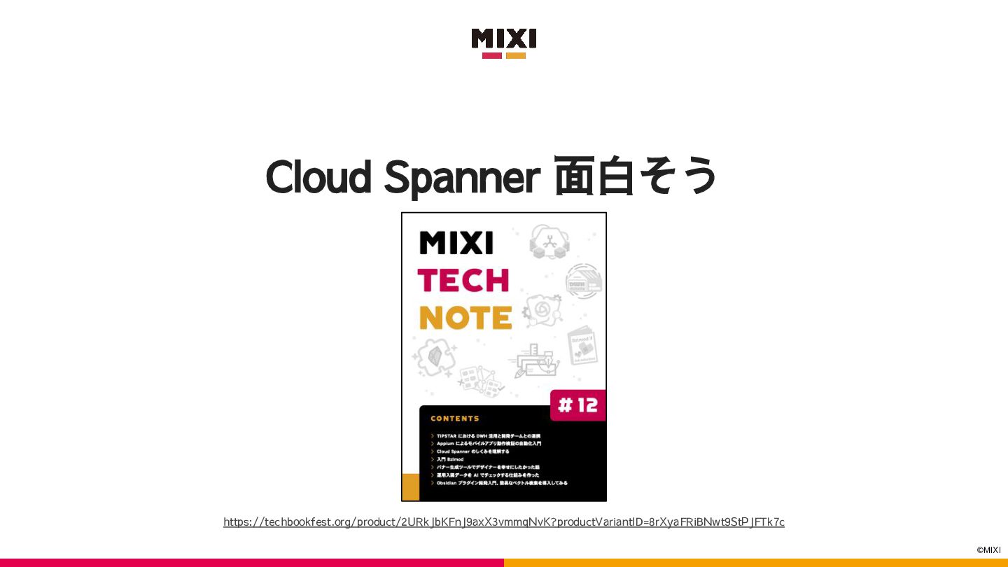 ©MIXI Cloud Spanner 面白そう https://techbookfest.org/product/2URkJbKFnJ9axX3vmmqNvK?productVariantID=8rXyaFRiBNwt9StPJFTk7c
