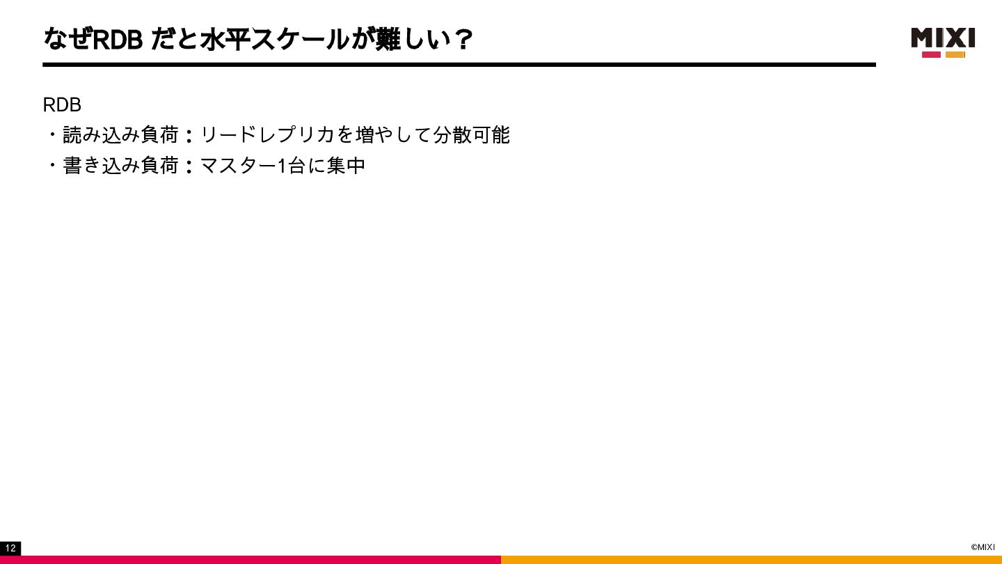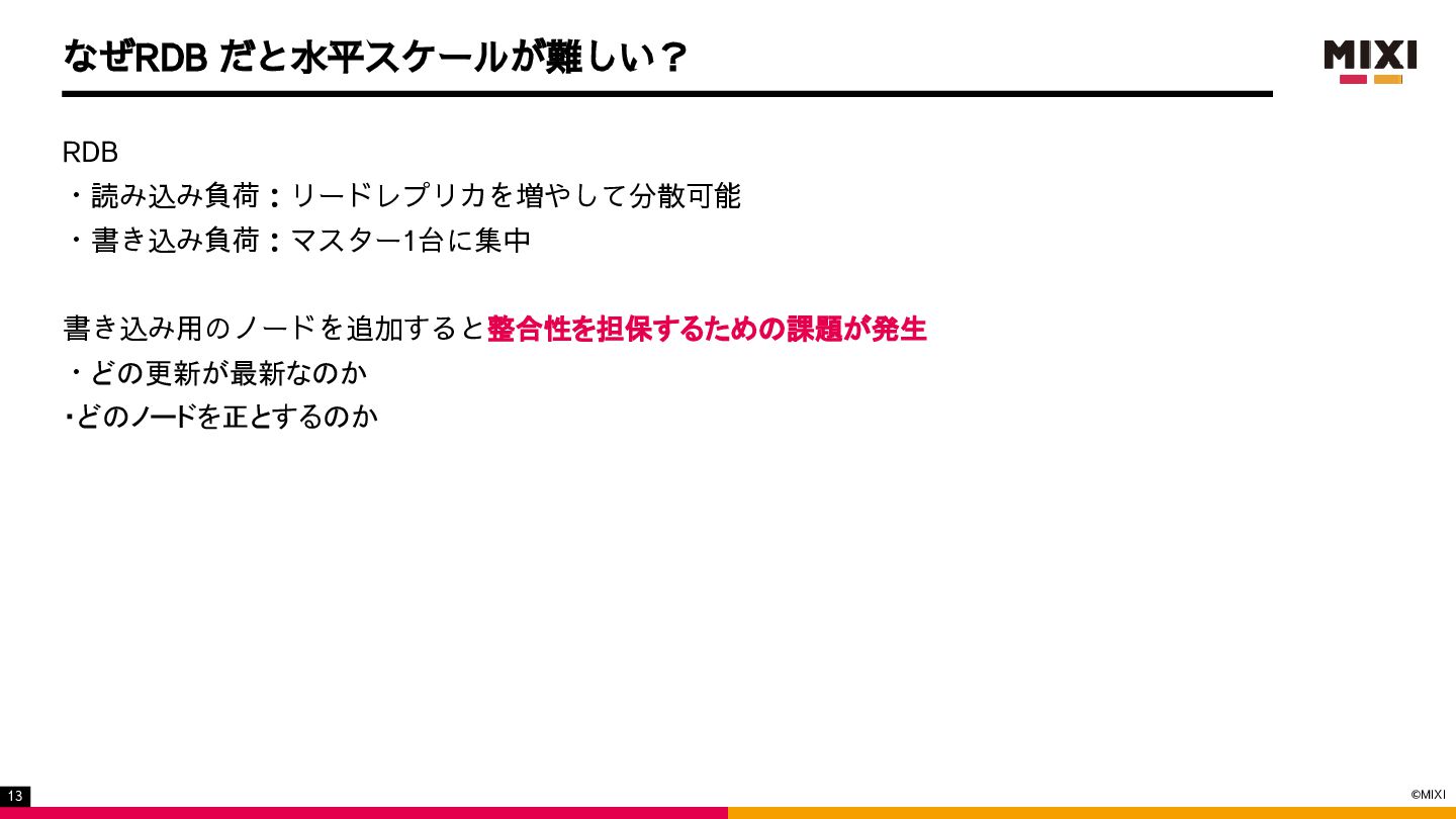 ©MIXI 12 なぜRDB だと水平スケールが難しい? RDB ・読み込み負荷:リードレプリカを増やして分散可能 ・書き込み負荷:マスター1台に集中