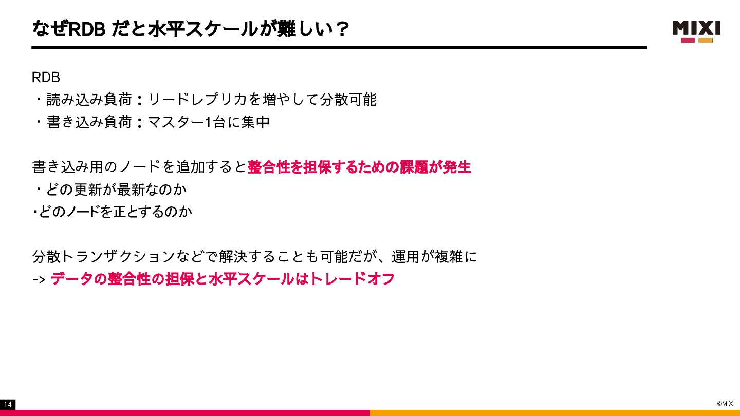 ©MIXI 13 なぜRDB だと水平スケールが難しい? RDB ・読み込み負荷:リードレプリカを増やして分散可能 ・書き込み負荷:マスター1台に集中 書き込み用のノードを追加すると整合性を担保するための課題が発生 ・どの更新が最新なのか ・どのノードを正とするのか