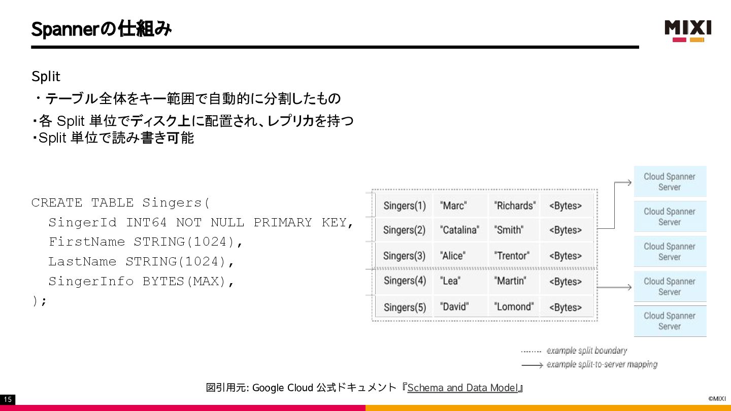 CREATE TABLE Singers( SingerId INT64 NOT NULL PRIMARY KEY, FirstName STRING(1024), LastName STRING(1024), SingerInfo BYTES(MAX), ); 図引用元: Google Cloud 公式ドキュメント『Schema and Data Model』