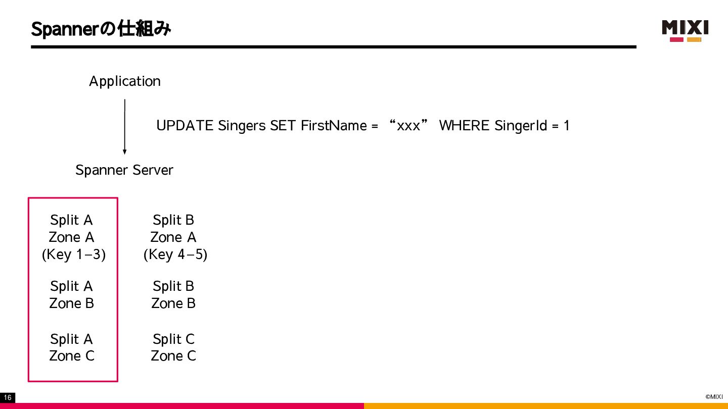 ©MIXI 15 Spannerの仕組み Split ・テーブル全体をキー範囲で自動的に分割したもの ・各 Split 単位でディスク上に配置され、レプリカを持つ ・Split 単位で読み書き可能