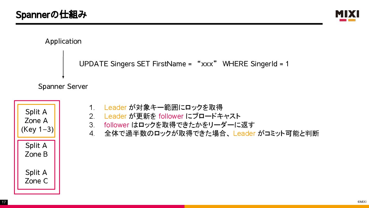 ©MIXI 16 Spannerの仕組み UPDATE Singers SET FirstName = “xxx” WHERE