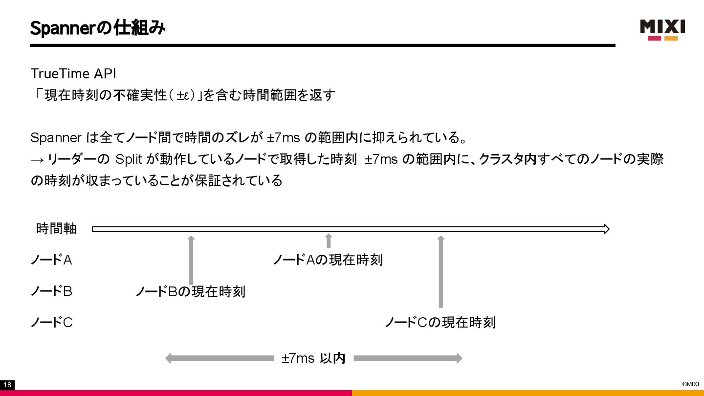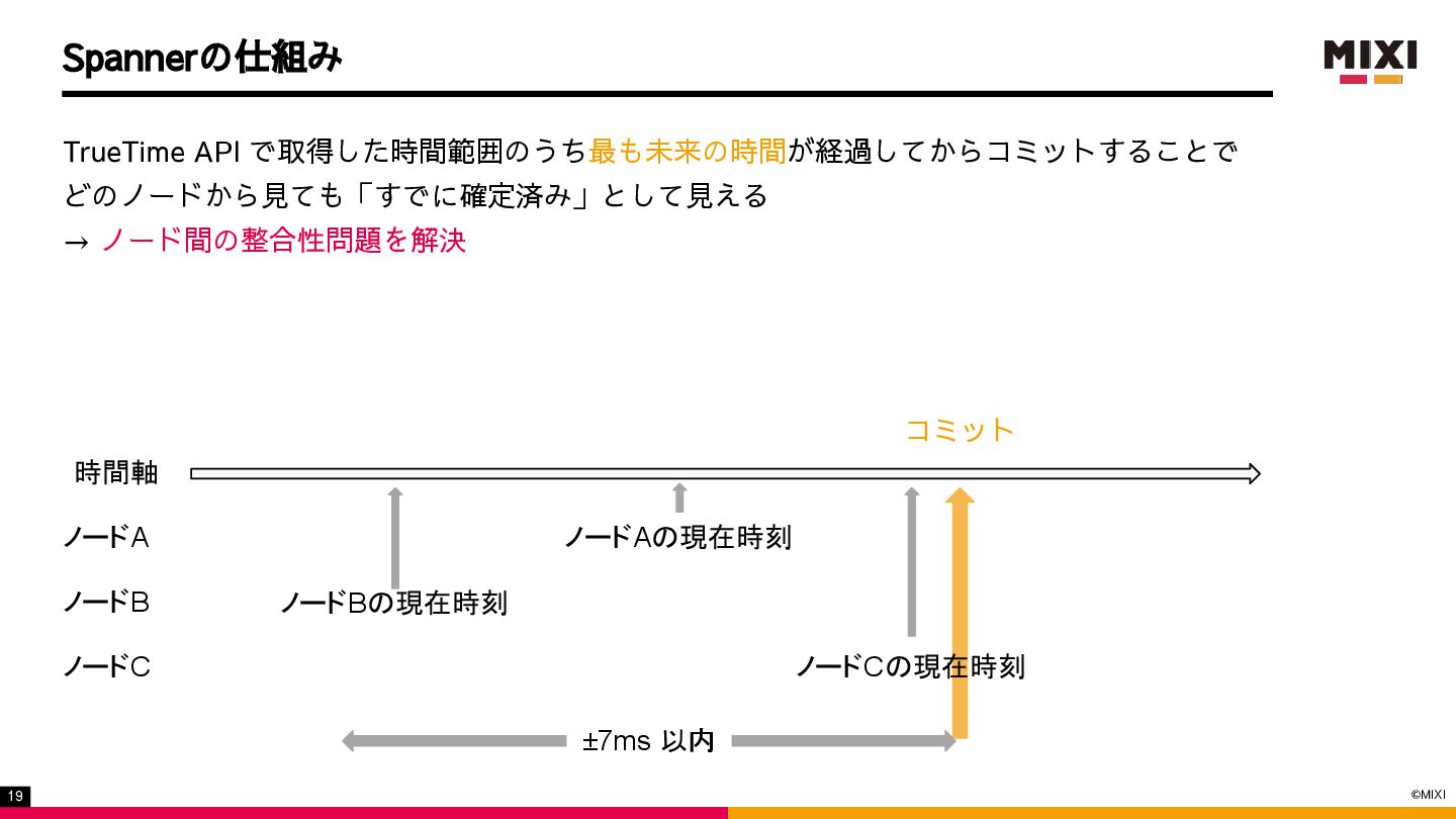©MIXI 18 Spannerの仕組み TrueTime API 「現在時刻の不確実性( ±ε)」を含む時間範囲を返す Spanner は全てノード間で時間のズレが ±7ms