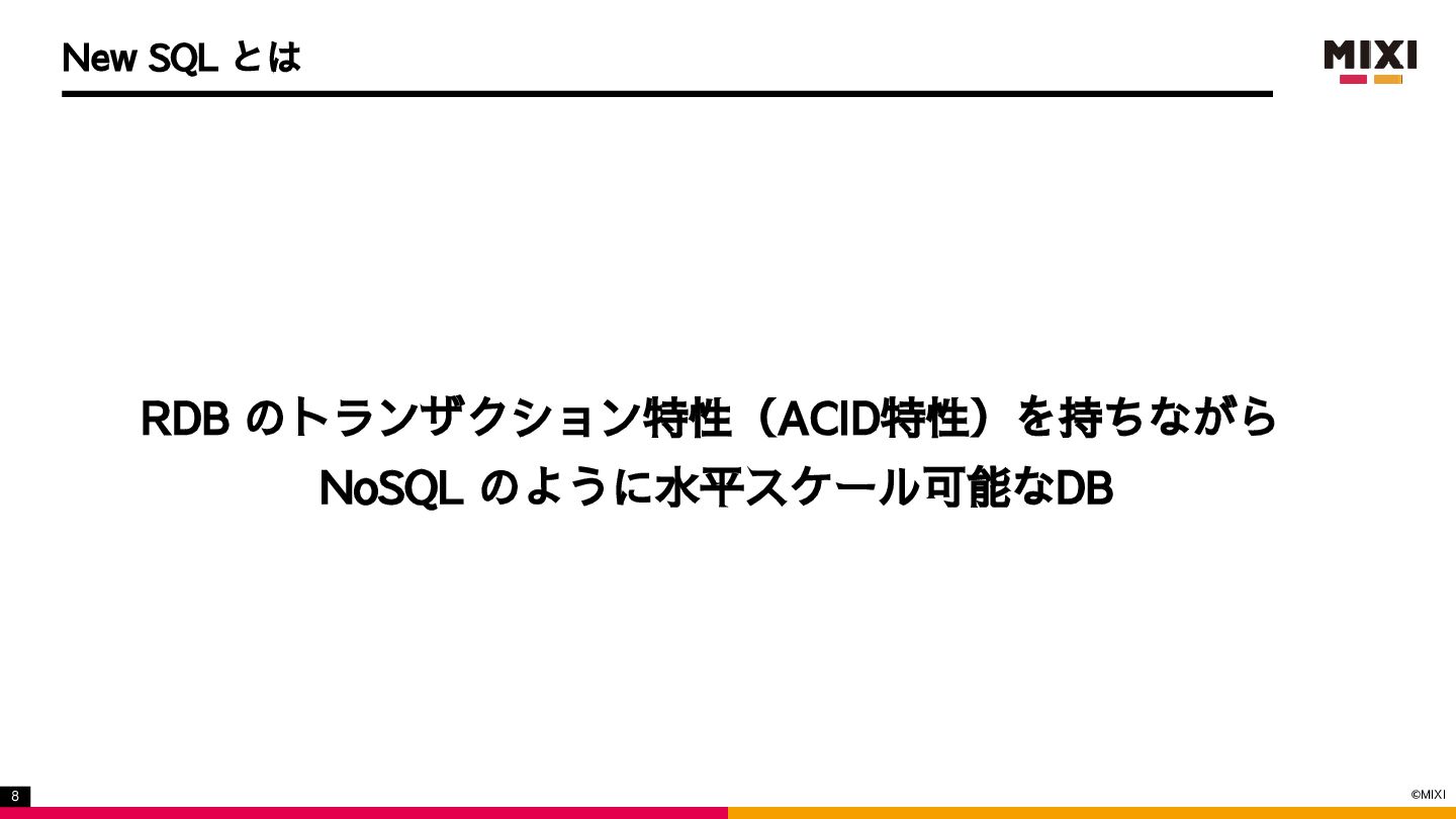 ©MIXI 8 New SQL とは RDB のトランザクション特性(ACID特性)を持ちながら NoSQL のように水平スケール可能なDB