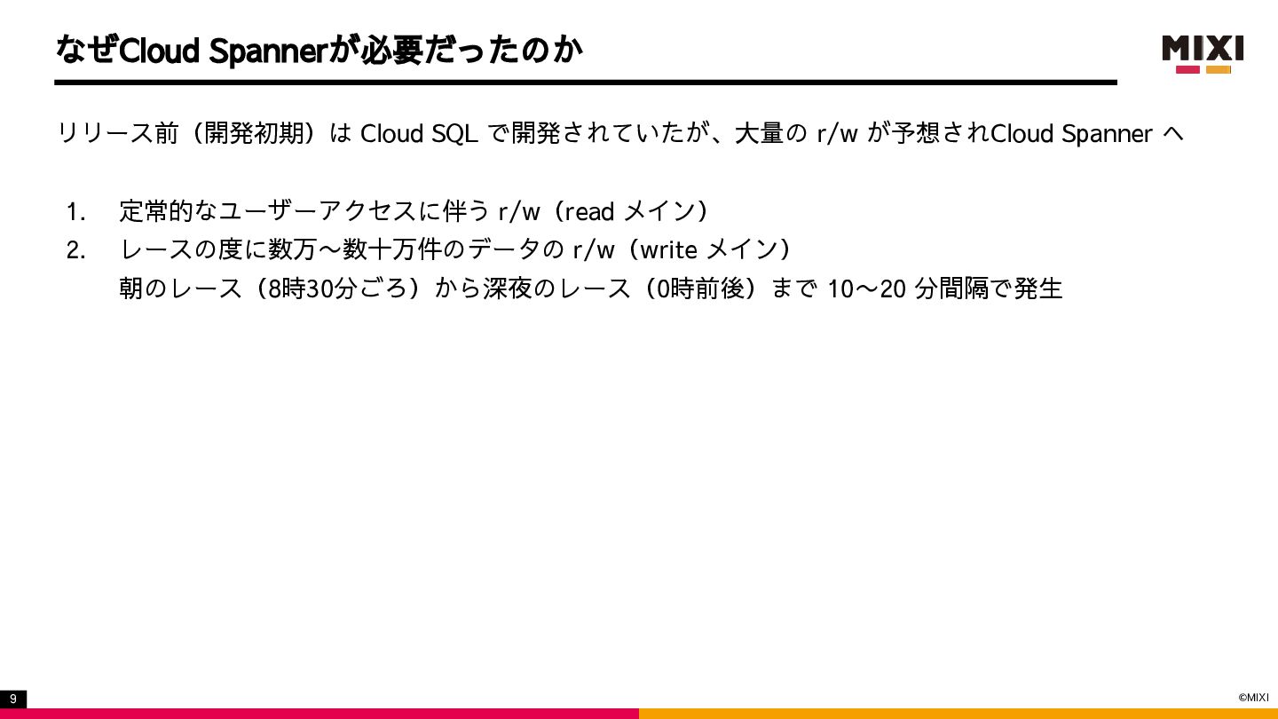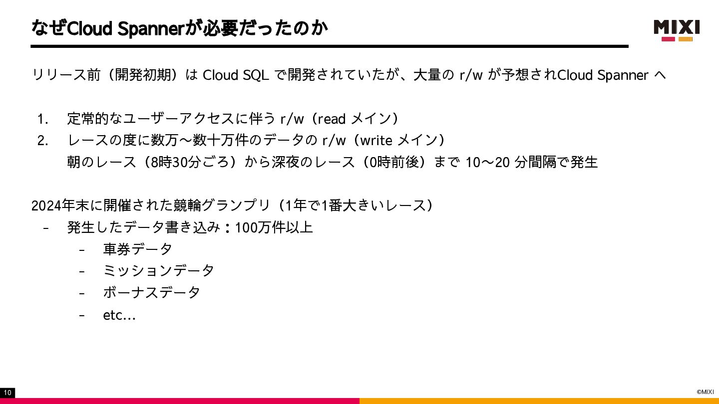 ©MIXI 9 なぜCloud Spannerが必要だったのか リリース前(開発初期)は Cloud SQL で開発されていたが、大量の r/w が予想されCloud