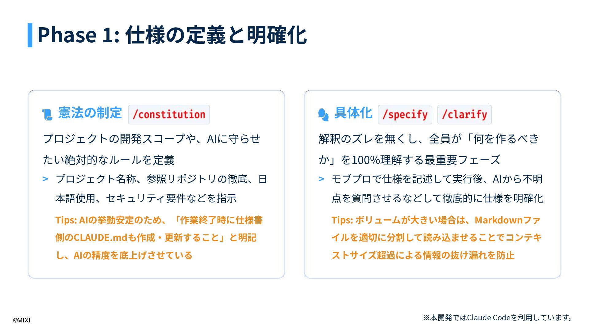 か」を100%理解する最重要フェーズ Tips: ボリュームが⼤きい場合は、Markdownファ イルを適切に分割して読み込ませることでコンテキ ストサイズ超過による情報の抜け漏れを防⽌ プロジェクト名称、参照リポジトリの徹底、⽇ 本語使⽤、セキュリティ要件などを指⽰ モブプロで仕様を記述して実⾏後、AIから不明 点を質問させるなどして徹底的に仕様を明確化 > > Phase 1: 仕様の定義と明確化 ※本開発ではClaude Codeを利⽤しています。