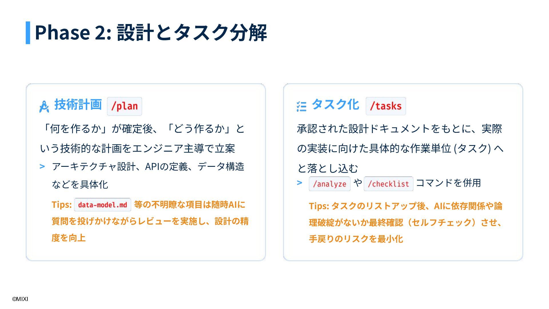 6. ©MIXI 技術計画 「何を作るか」が確定後、「どう作るか」と いう技術的な計画をエンジニア主導で⽴案 Tips: 等の不明瞭な項⽬は随時AIに 質問を投げかけながらレビューを実施し、設計の精 度を向上 タスク化 承認された設計ドキュメントをもとに、実際