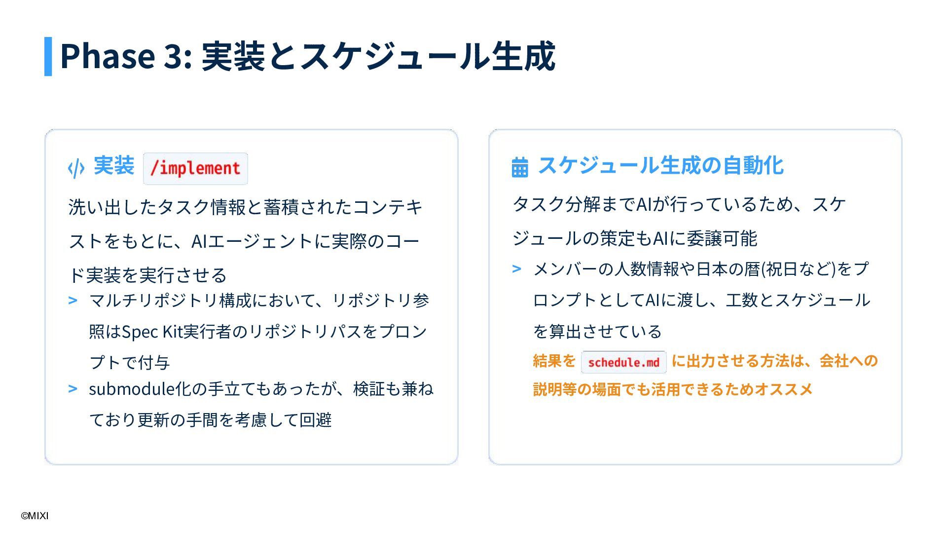 7. ©MIXI 実装 洗い出したタスク情報と蓄積されたコンテキ ストをもとに、AIエージェントに実際のコー ド実装を実⾏させる スケジュール⽣成の⾃動化 タスク分解までAIが⾏っているため、スケ ジュールの策定もAIに委譲可能 結果を に出⼒させる⽅法は、会社への