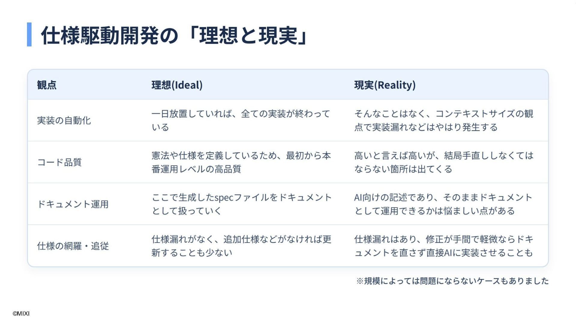 8. ©MIXI ※規模によっては問題にならないケースもありました 観点 理想(Ideal) 現実(Reality) 実装の⾃動化 ⼀⽇放置していれば、全ての実装が終わっている そんなことはなく、コンテキストサイズの観点で 実装漏れなどはやはり発⽣する コード品質