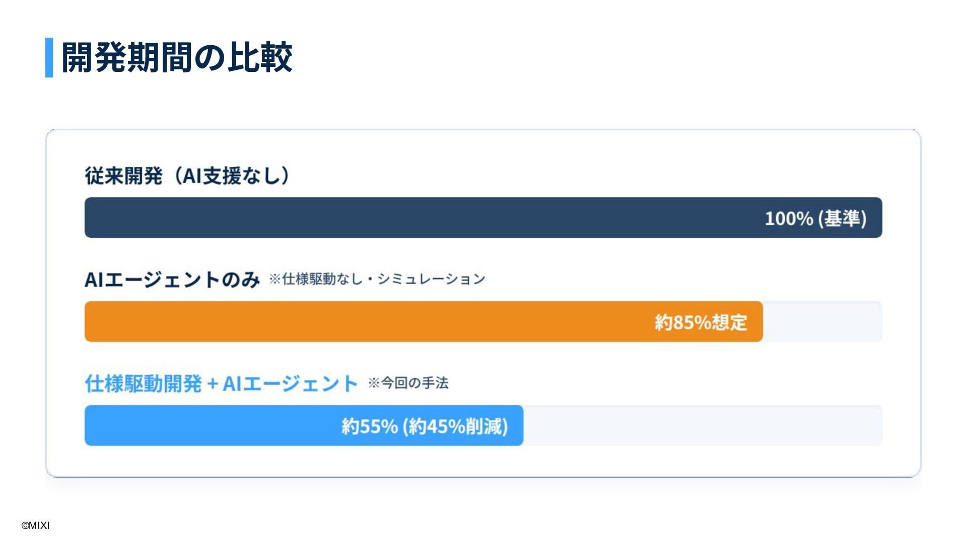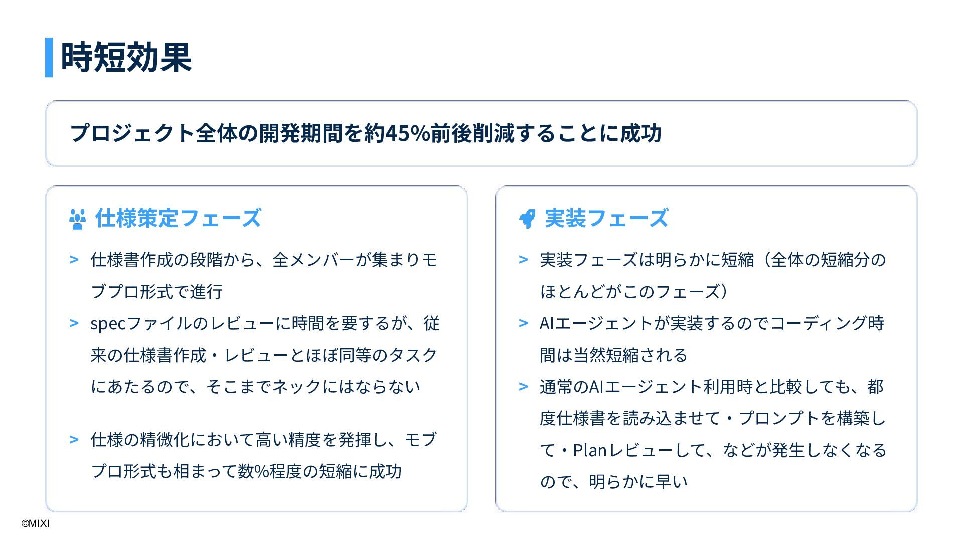 9. ©MIXI プロジェクト全体の開発期間を約45%前後削減することに成功 仕様策定フェーズ 実装フェーズ 仕様書作成の段階から、全メンバーが集まりモ ブプロ形式で進⾏ specファイルのレビューに時間を要するが、従 来の仕様書作成‧レビューとほぼ同等のタスク にあたるので、そこまでネックにはならない 仕様の精微化において⾼い精度を発揮し、モブ