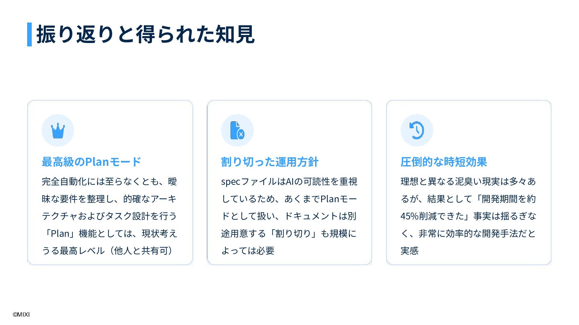 10. ©MIXI 最⾼級のPlanモード 完全⾃動化には⾄らなくとも、曖 昧な要件を整理し、的確なアーキ テクチャおよびタスク設計を⾏う 「Plan」機能としては、現状考え うる最⾼レベル(他⼈と共有可) 割り切った運⽤⽅針 specファイルはAIの可読性を重視 しているため、あくまでPlanモー
