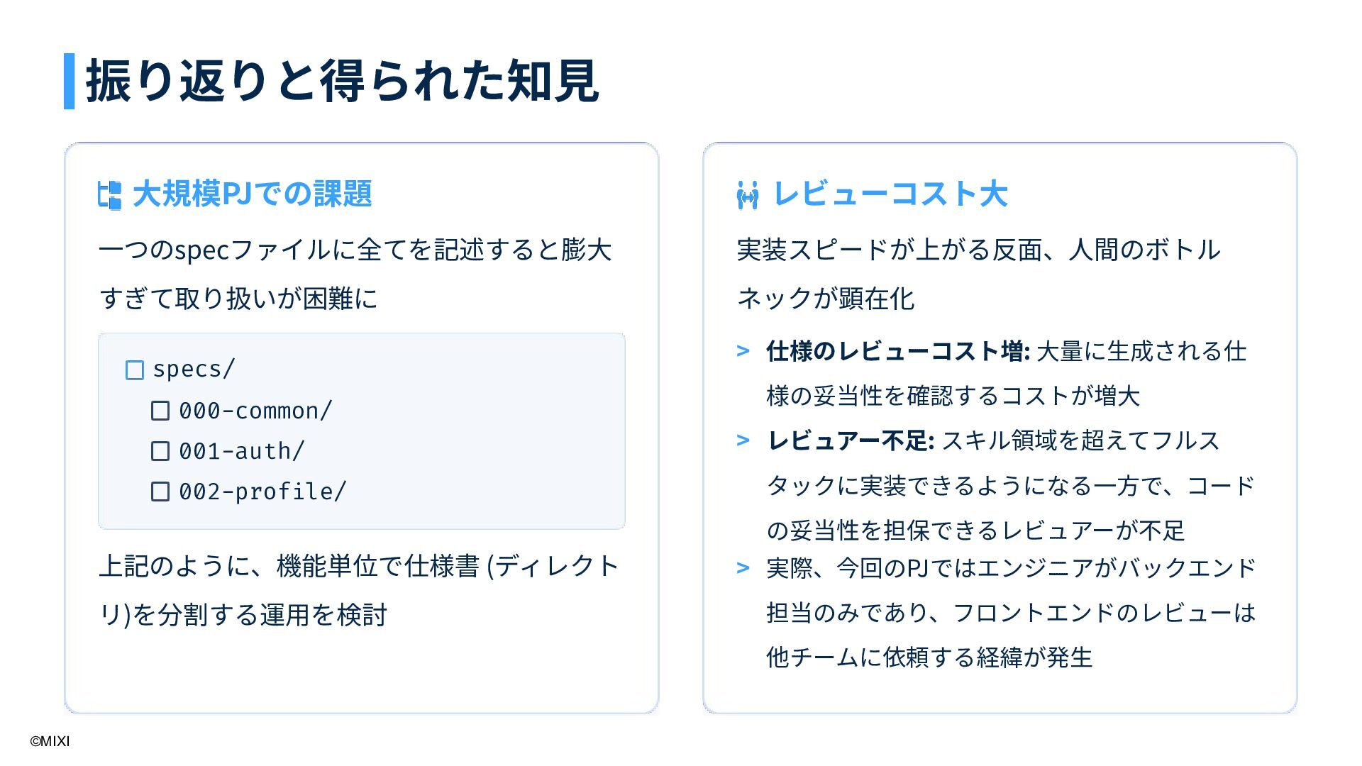 specs/ 000-common/ 001-auth/ 002-profile/ 仕様のレビューコスト増: ⼤量に⽣成される仕 様の妥当性を確認するコストが増⼤ レビュアー不⾜: スキル領域を超えてフルス タックに実装できるようになる⼀⽅で、コード の妥当性を担保できるレビュアーが不⾜ 実際、今回のPJではエンジニアがバックエンド 担当のみであり、フロントエンドのレビューは 他チームに依頼する経緯が発⽣ > > > 振り返りと得られた知⾒